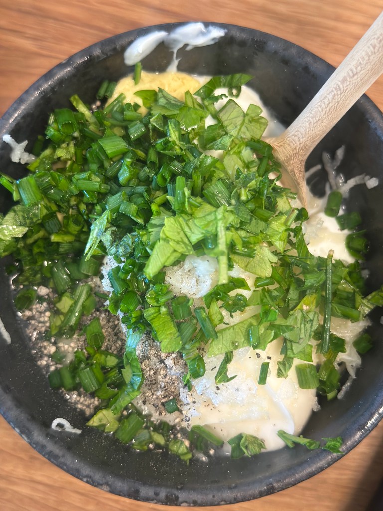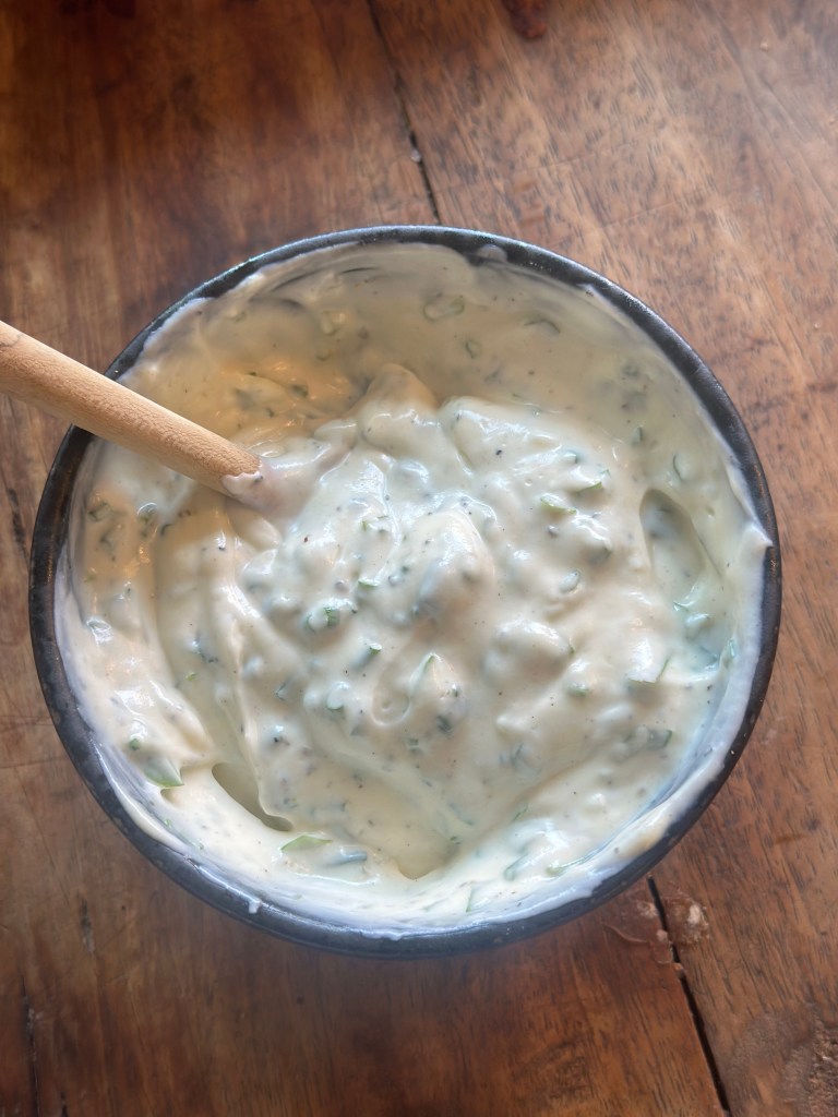 Dressingen jeg bruger her er min klassiske cremefraiche – se min opskrift her !