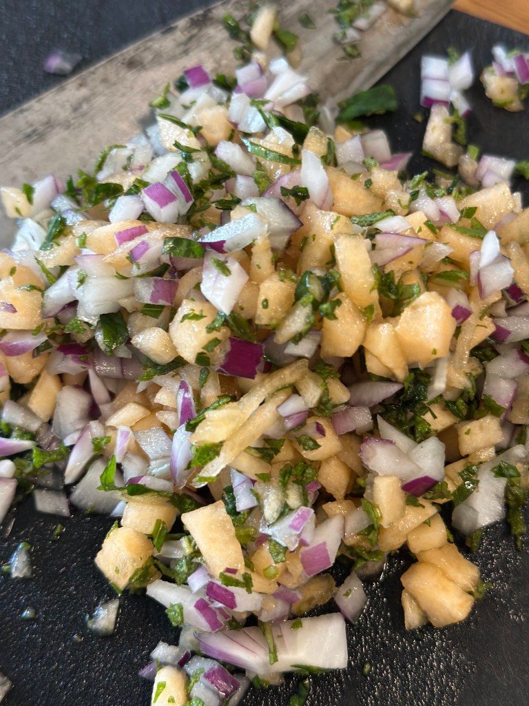 Melon og løg skal skæres i meget små tern. Ligeledes med krydderurterne – pas på med Salvie, da smagen kan overdøve retten. Riv eller mos hvidløget og bland det hele godt med olivenolie, salt og peber.