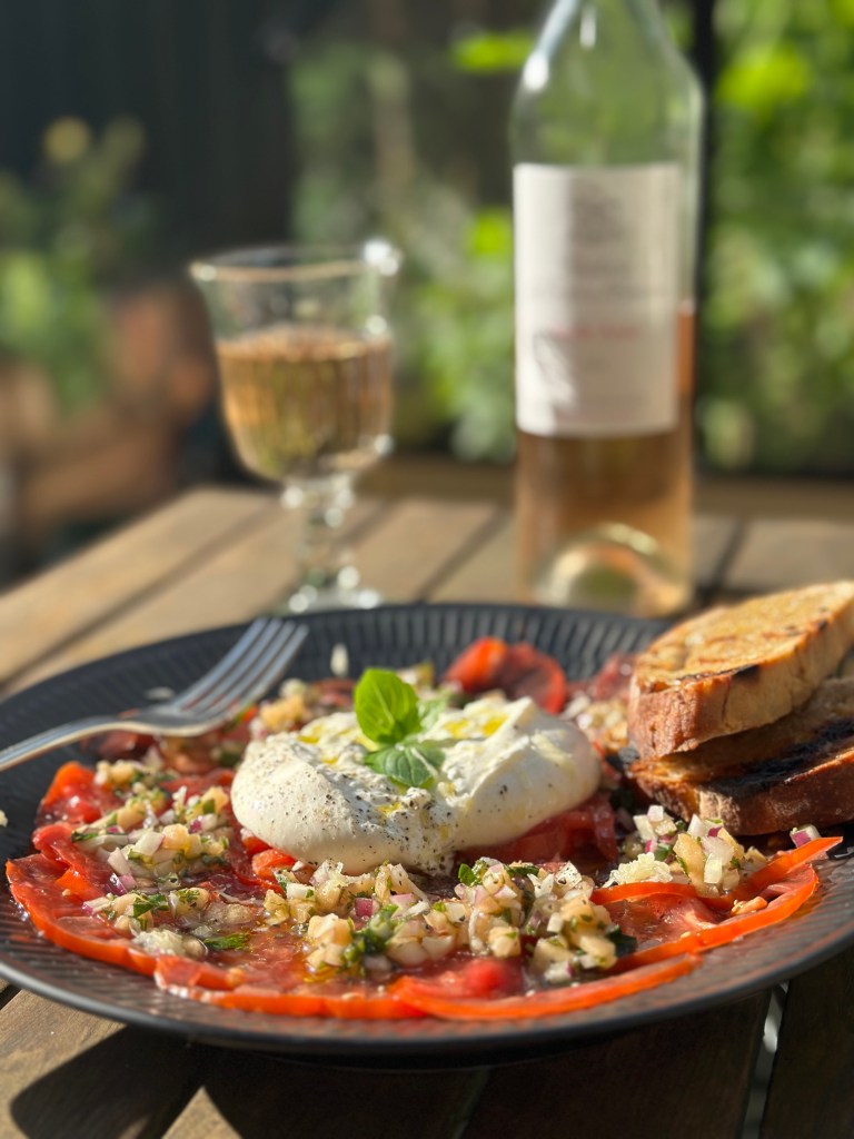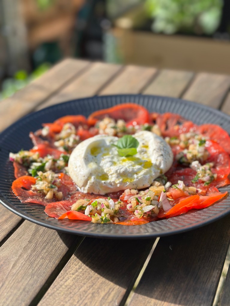 Fordel tomatskiverne på en tallerken eller fad. Burrataen skal placeres i midten og åbnes. Fordel topping og afslut med at fordele oliven olie, salt og peber. Pynt med et par basilikum blade. Server med godt brød – jeg har valgt et fra microbageren i Listed på Bornholm.