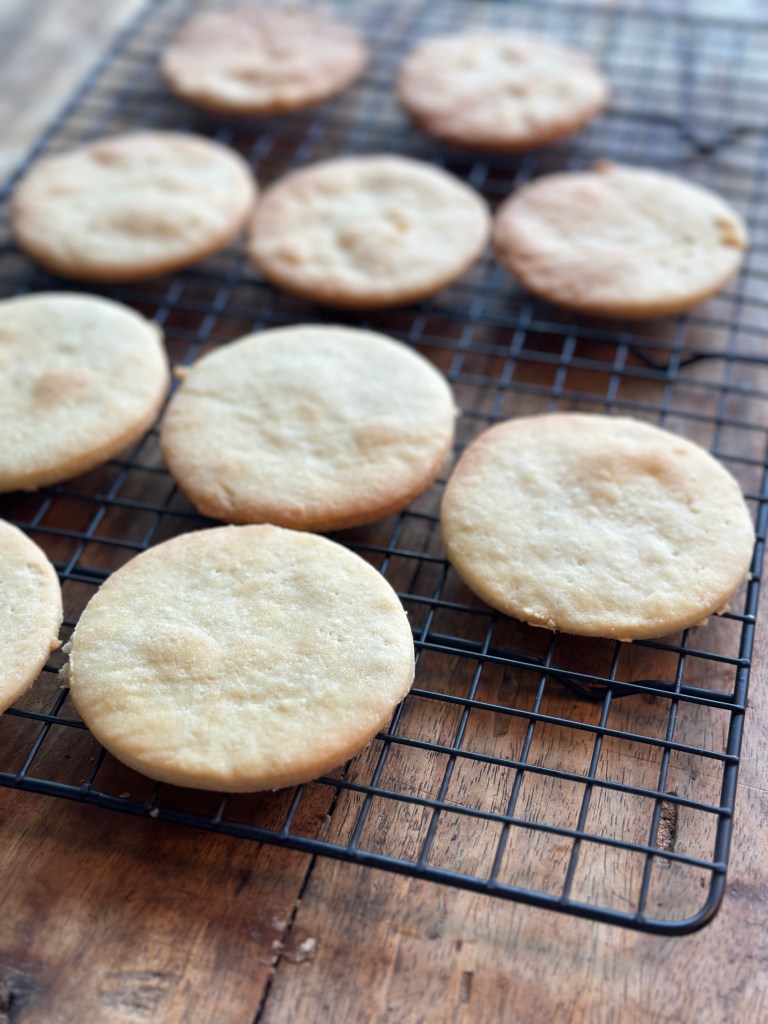 Det kræver lidt finesse at rulle dejen ud, men jeg gør det mellem 2 stykker bagepapir. Tykkelsen kommer faktisk til at passe, hvis du ruller jævnt ud til kanterne – 3 mm er passende – 5 mm er for tykt. Herefter udstikker du til passende medaljer og fjerner den overskydende dej. Lad dem blot ligge på bagepapiret.