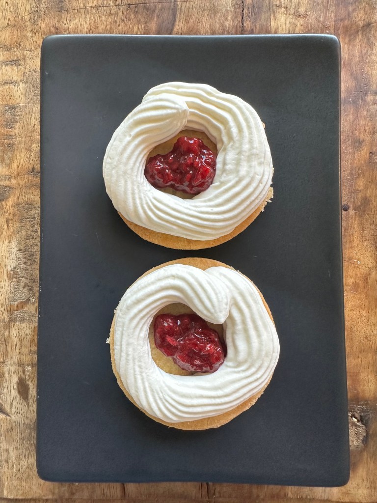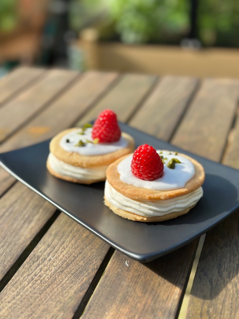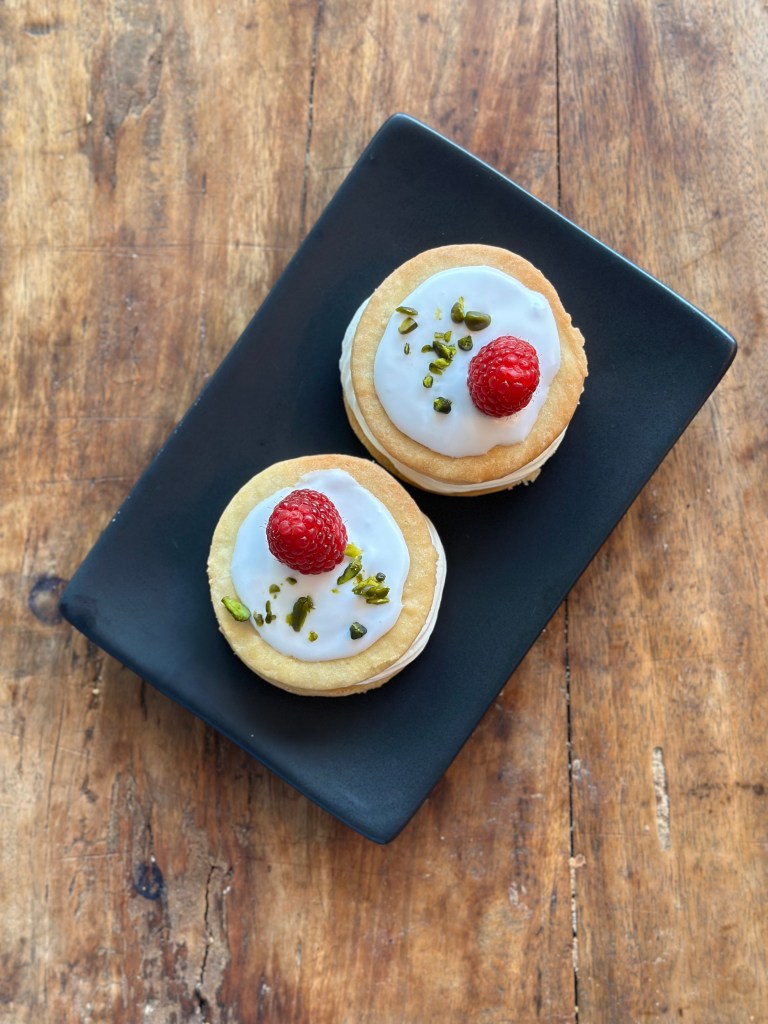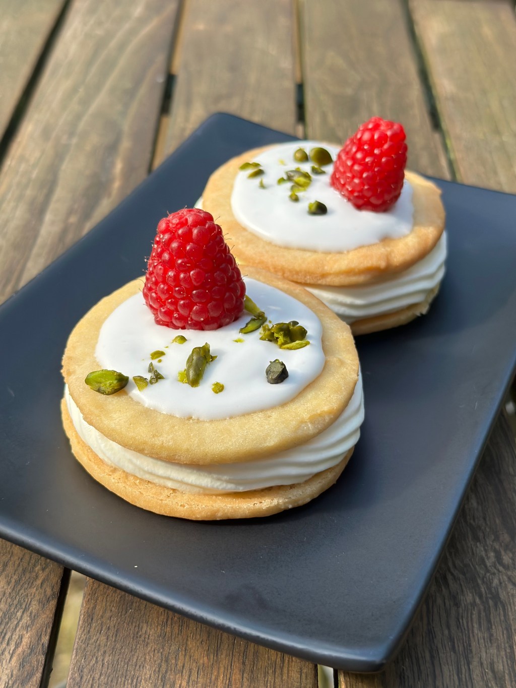 Jeg bruger bagsiden af en ske til at fordele glasuren, men en sprøjtepose fungerer også. Pynter med et enkelt frisk hindbær og lidt hakkede pistacienødder.