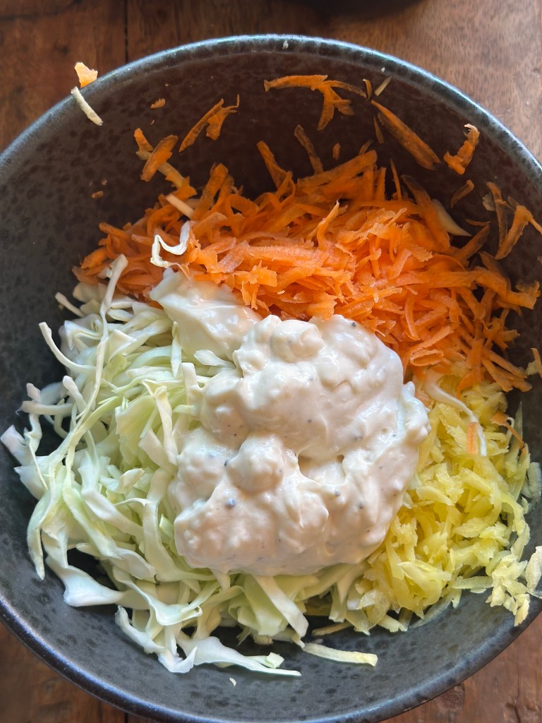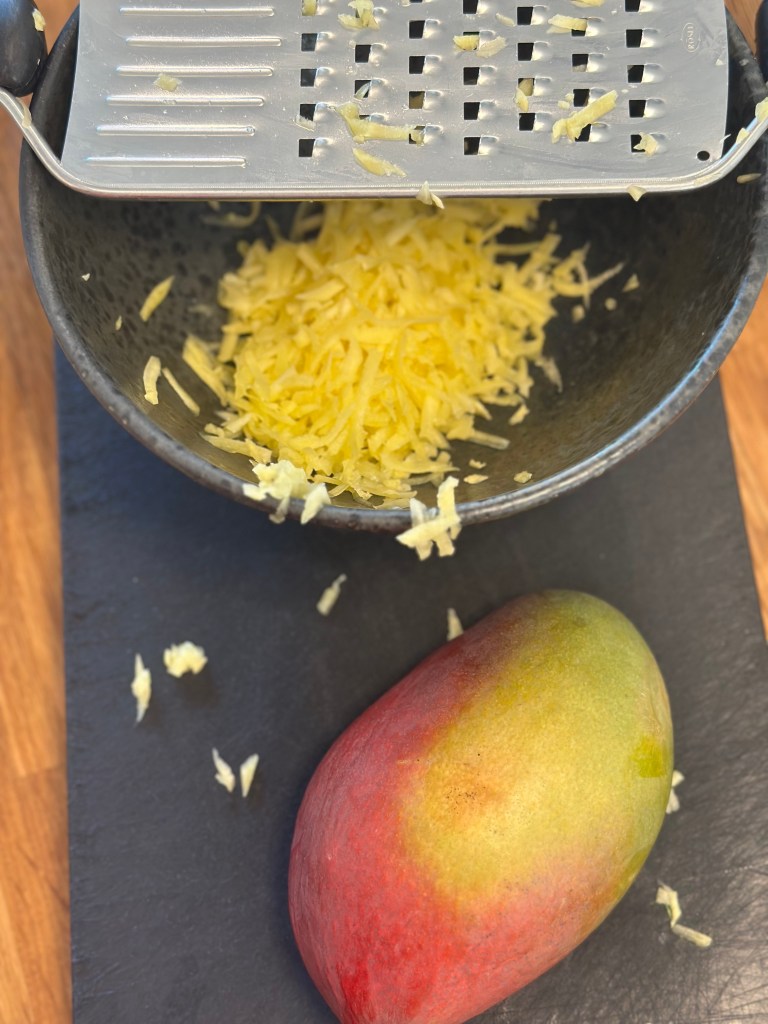 Den er nem at lave. Riv gulerødder, mango og kålet fint. Bland dressingen og bland den i råkosten. Mangoen skal ikke være for moden, så er den svær at rive – men i Danmark bliver det nok ikke et problem, der sælges næsten kun umodne mangos.