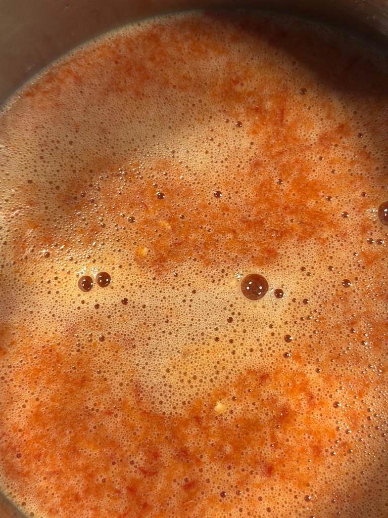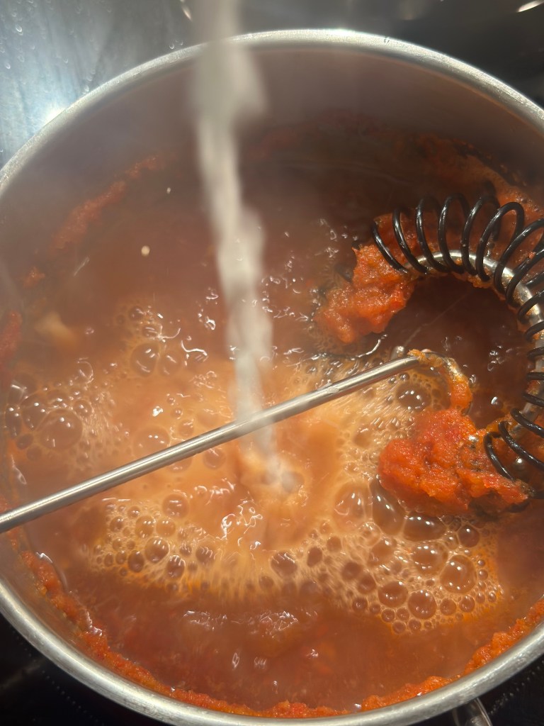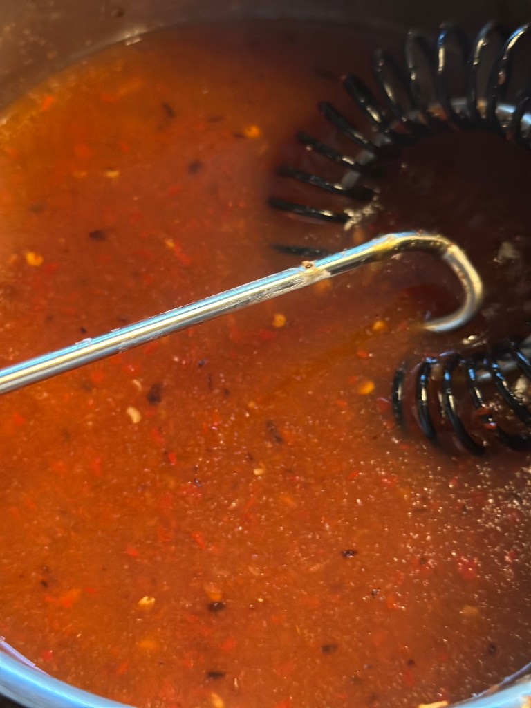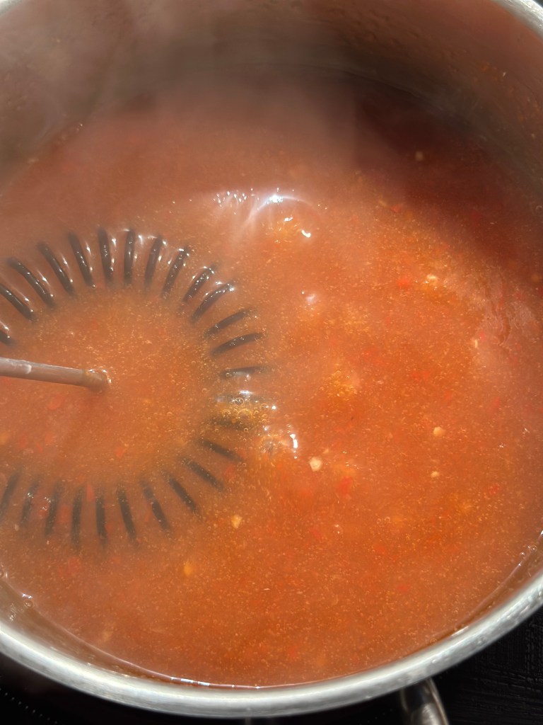 Hak chilierne sammen med hvidløg. Kom dem i en blander sammen med 1 dl vand. Blendes godt. Kom det hele sammen med de sidste ingredienser i en kaserolle og varm op til kogepunktet. Shake den sidste 1 dl vand med marzenamelet og jævn saucen. Køl ned og så kan den sagtens holde sig en måneds tid på køl.