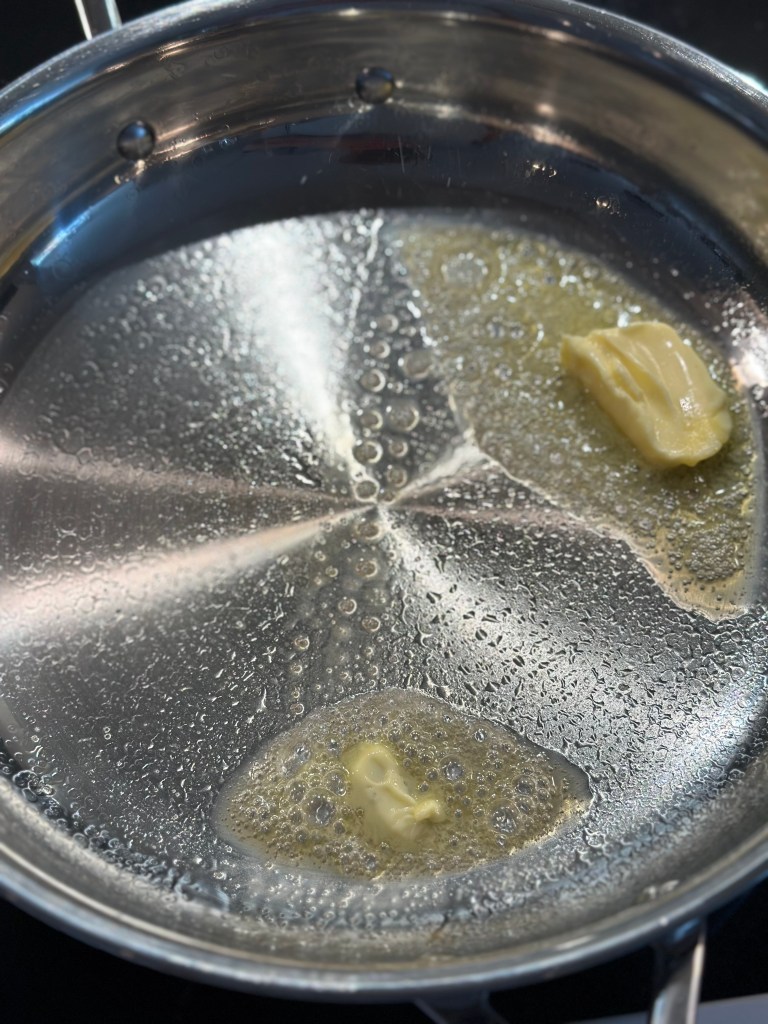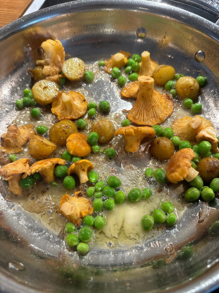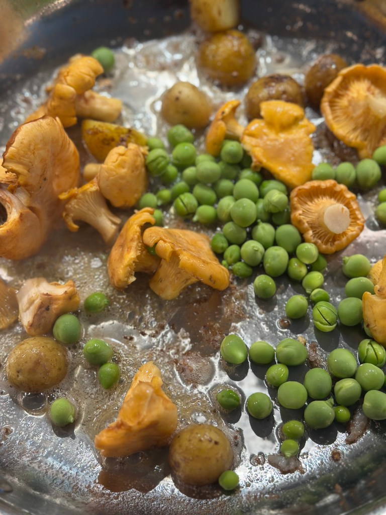 Kantereller har sæson fra midt Juli til en gang i Oktober. Jeg skyller den og skærer bunden af. Kommer på panden sammen med de øvrige ingredienser på panden i smør. Læs mere om kantereller her !