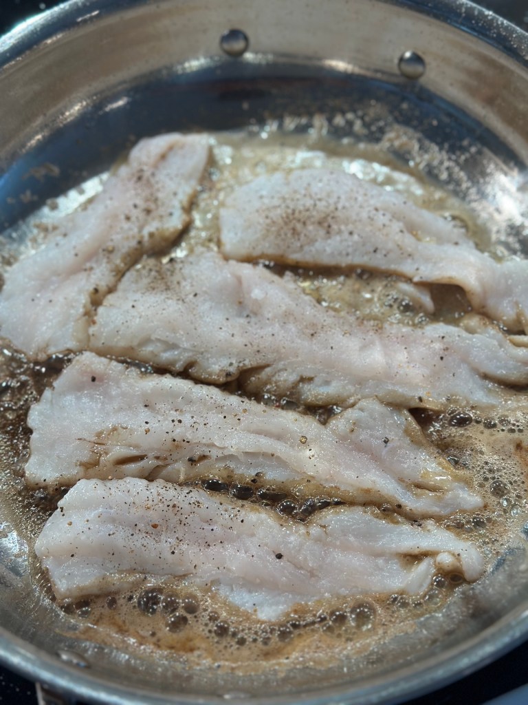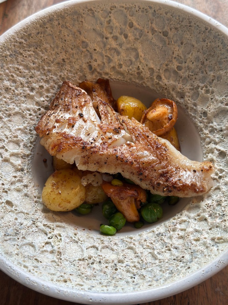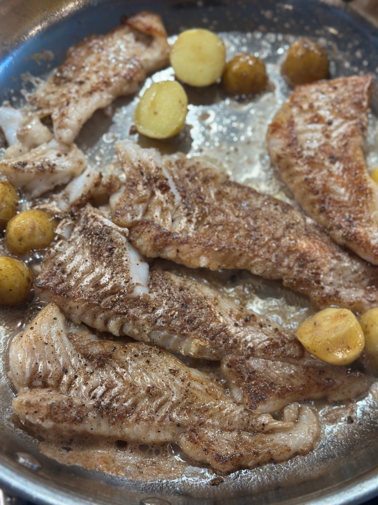 Torsken skal smørsteges i rigelig med smør, og den må meget gerne være brun før fisken kommer på. Torsken er kun krydret med salt og peber. Tilsæt nye kartofler som er kogt på forhånd.