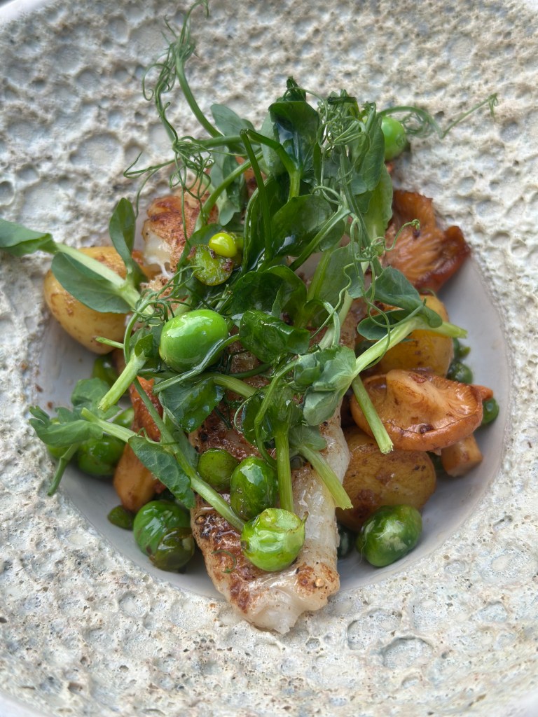 Jeg monterer retten med grøntsagerne i bunden. Kommer torsken oven på, og topper med ærteskud og kommer det sidste af smørret ovenpå.