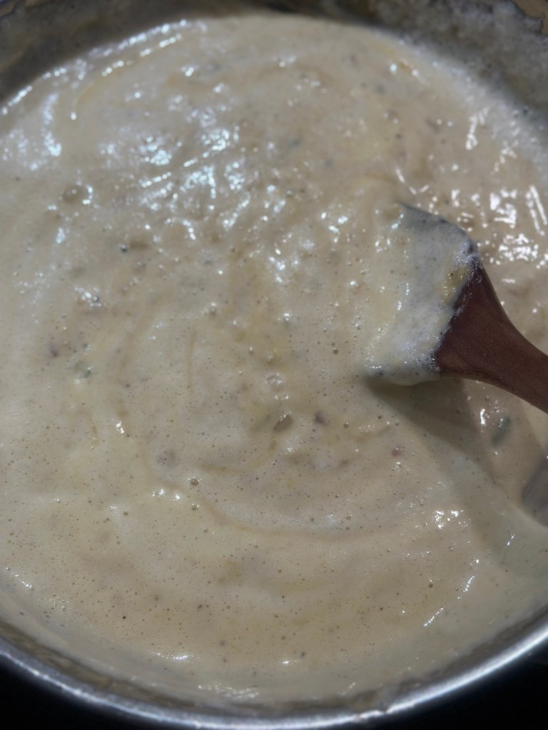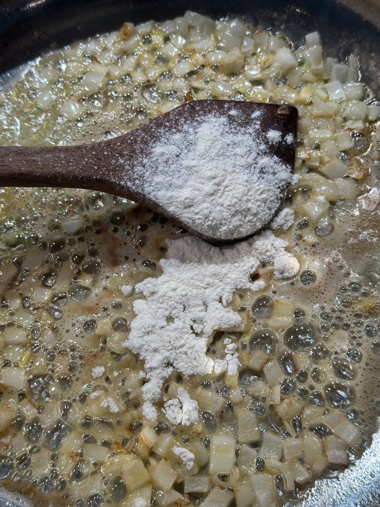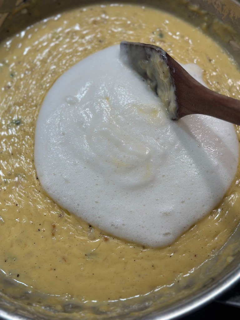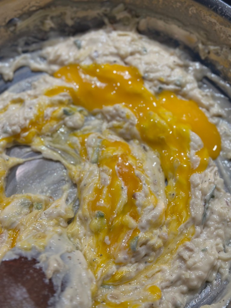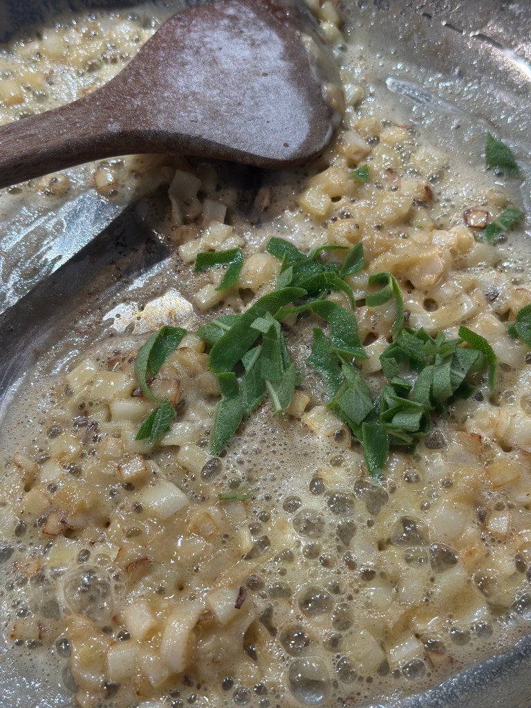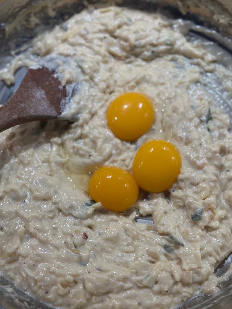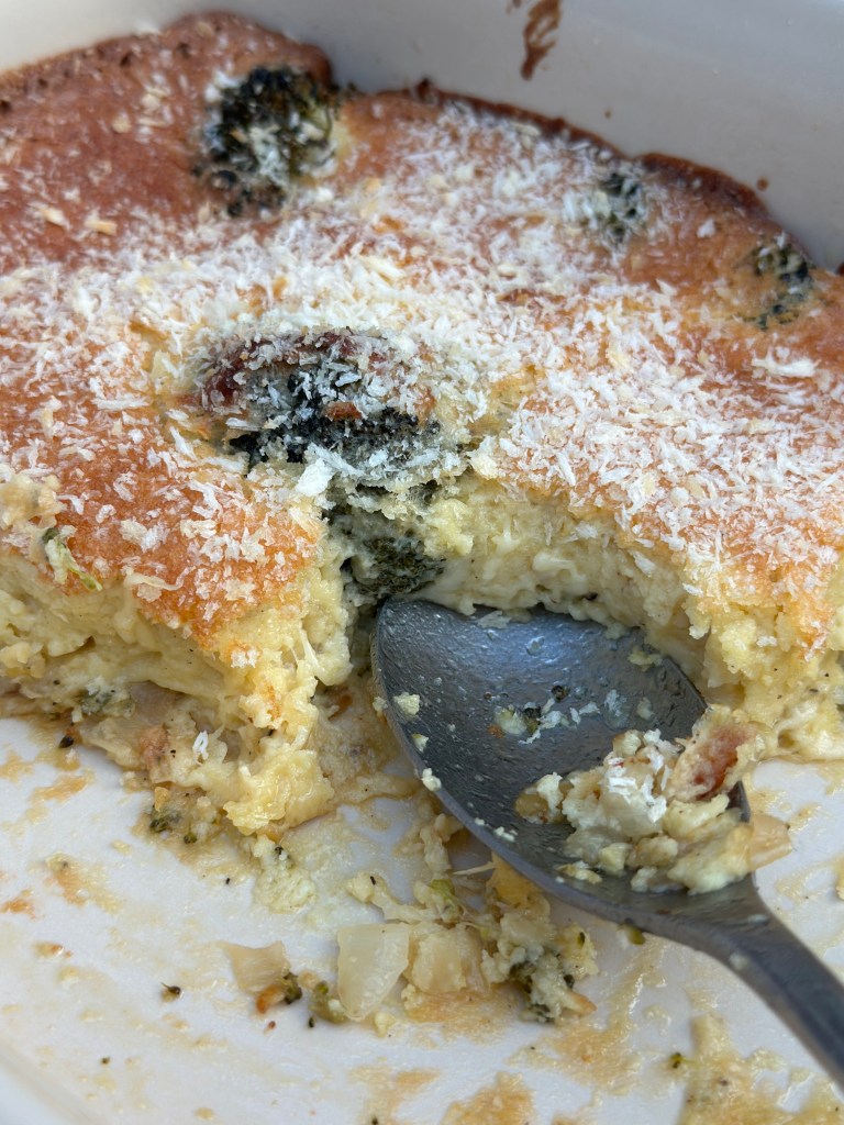 Kom olivenolie på en mellemvarm pande. Tilsæt løgene, og brun dem let. Tilsæt smør. Strø melet henover og bland det godt. Tilsæt salvie, salt og peber. Tilsæt fløden og bag saucen op. Kom osten i, og når det hele en en homogen masse, køler du den lidt ned. Herefter kommer man 3 æggeblommer i, og blander godt. Broccoli kommer først i fadet med olivenolie over – og brunes let. I mens broccoli er i ovnen, piskes hviderne stive. Hviderne vendes let over i æg/ost massen, og kommes over broccoli. Drys pankoraps ovenpå. I ovnen i 30 minutter ved 180 grader.