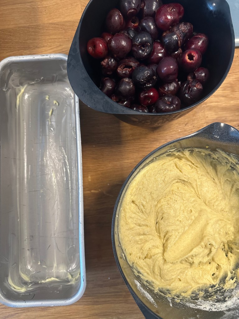 Start med at udstene kirsebærene. Det er nemmest med en udstenertang. Herefter blander du alle de andre ingredienser – og smørret skal have stuetemperatur.