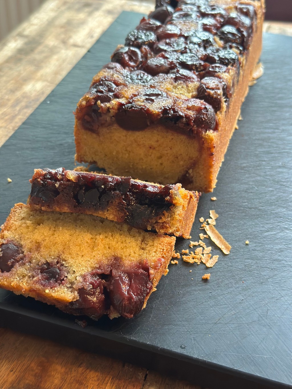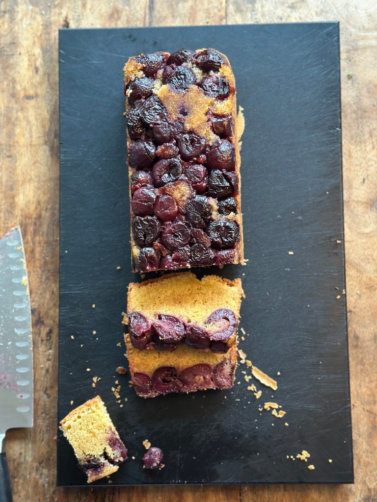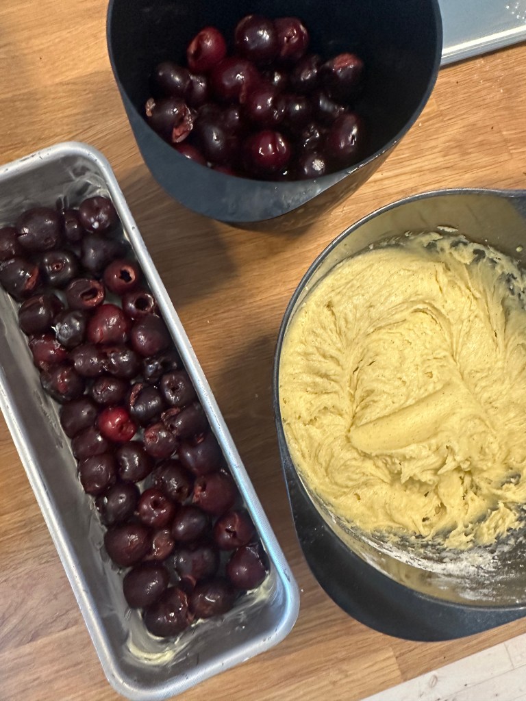 Jeg fik ideen til denne kage, efter at have kigge på “udside/down” kager. OG så tænkte jeg, det kunne nok også fungere med en sandkage og kirsebær. Og tøj, den smager godt…