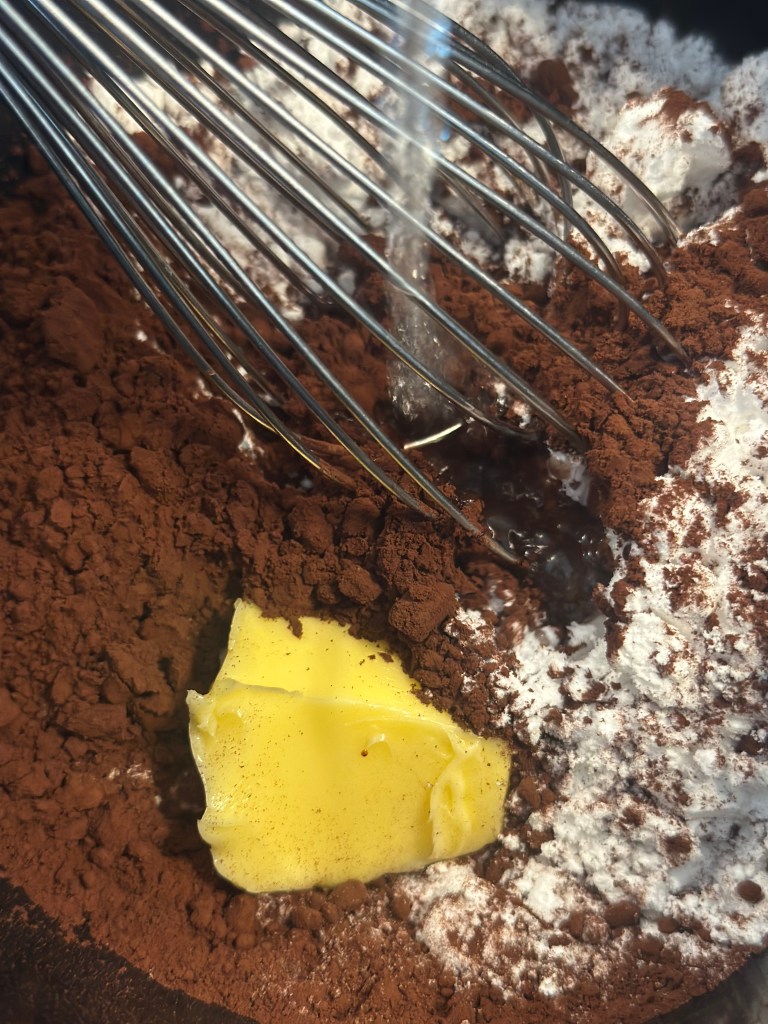 Smøret skal være blødt, og blandes med alle de øvrige ingredienser – undtagen vandet. Når det er blandet godt, kommer du det kogende vand i, som får dejen til at blive ensartet og flydende.