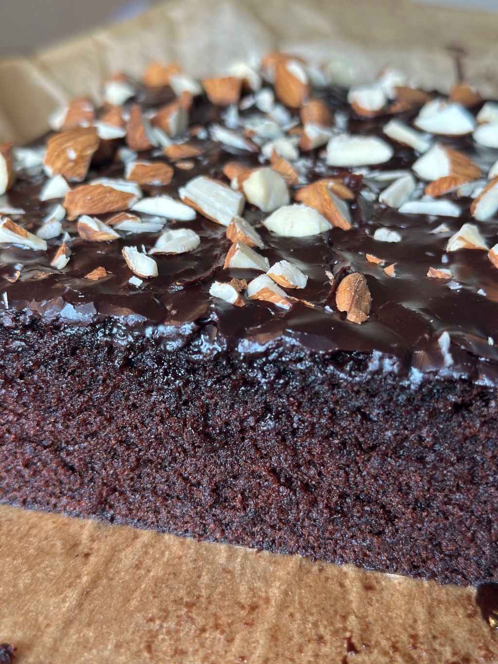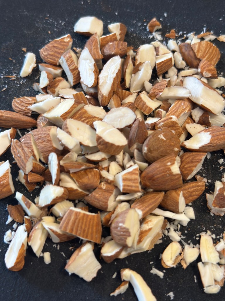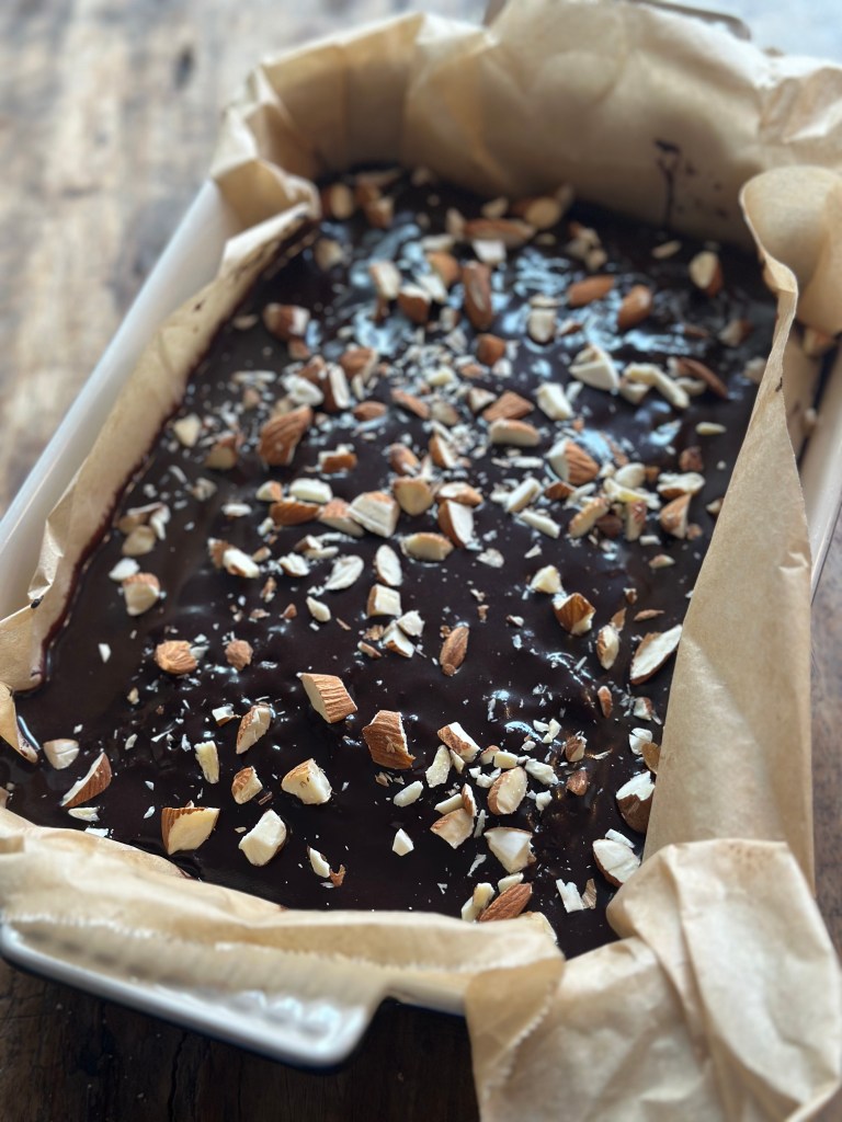 Det hele piskes godt sammen. Den skal være glat, men trække lidt spor på piskeriset. Kommes på kagen når den er næsten afkølet. Toppes med hakkede mandler.