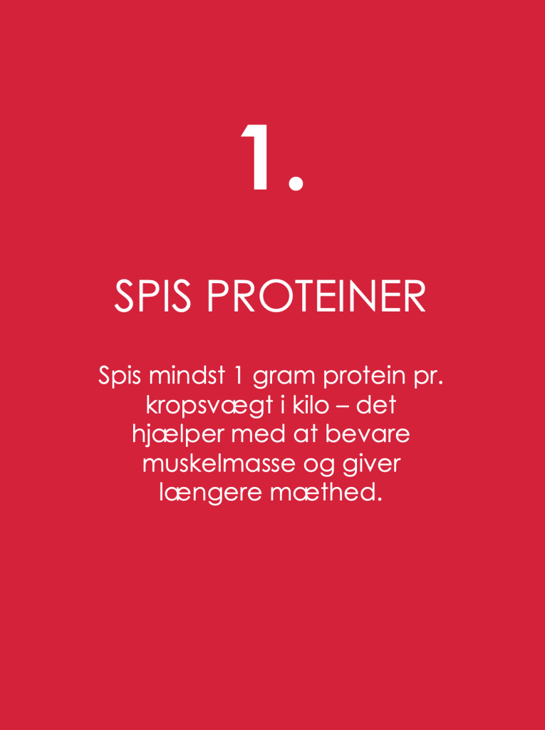 1. SPIS PROTEINER Spis mindst 1 gram protein pr. kropsvægt i kilo – det hjælper med at bevare muskelmasse og giver længere mæthed.