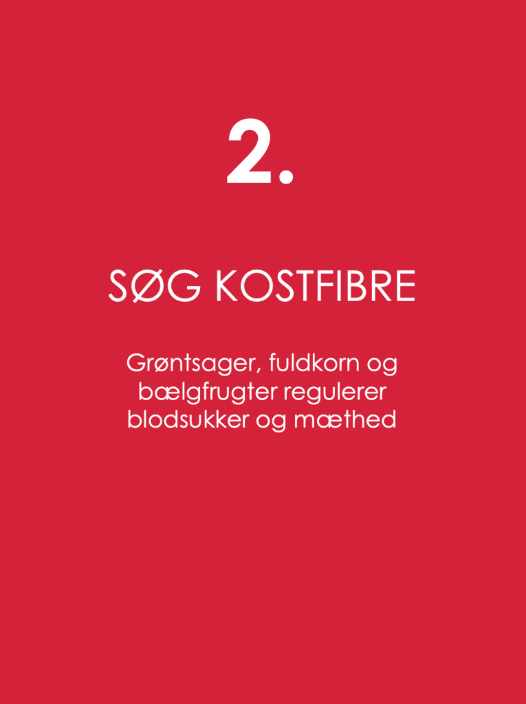 2. SØG KOSTFIBRE Grøntsager, fuldkorn og bælgfrugter regulerer blodsukker og mæthed.