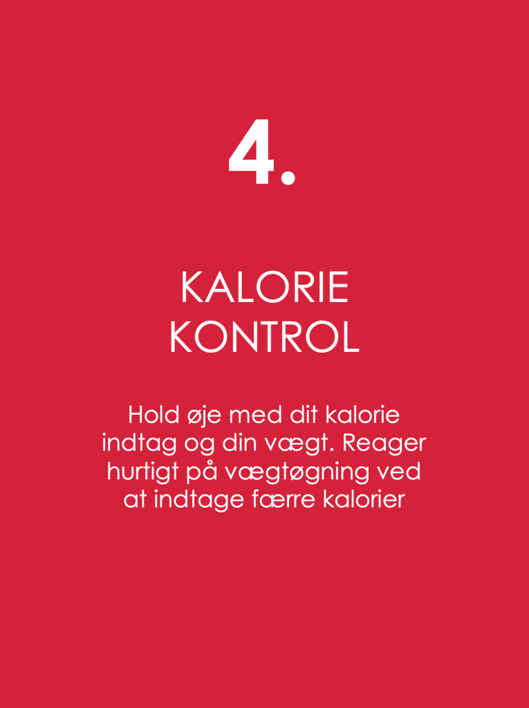 4. KALORIE KONTROL Hold øje med dit kalorie indtag og din vægt. Reager hurtigt på vægtøgning ved at indtage færre kalorier