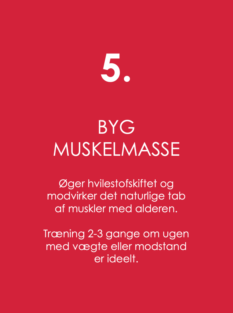 5. BYG MUSKELMASSE Øger hvilestofskiftet og modvirker det naturlige tab af muskler med alderen. Træning 2-3 gange om ugen med vægte eller modstand er ideelt.