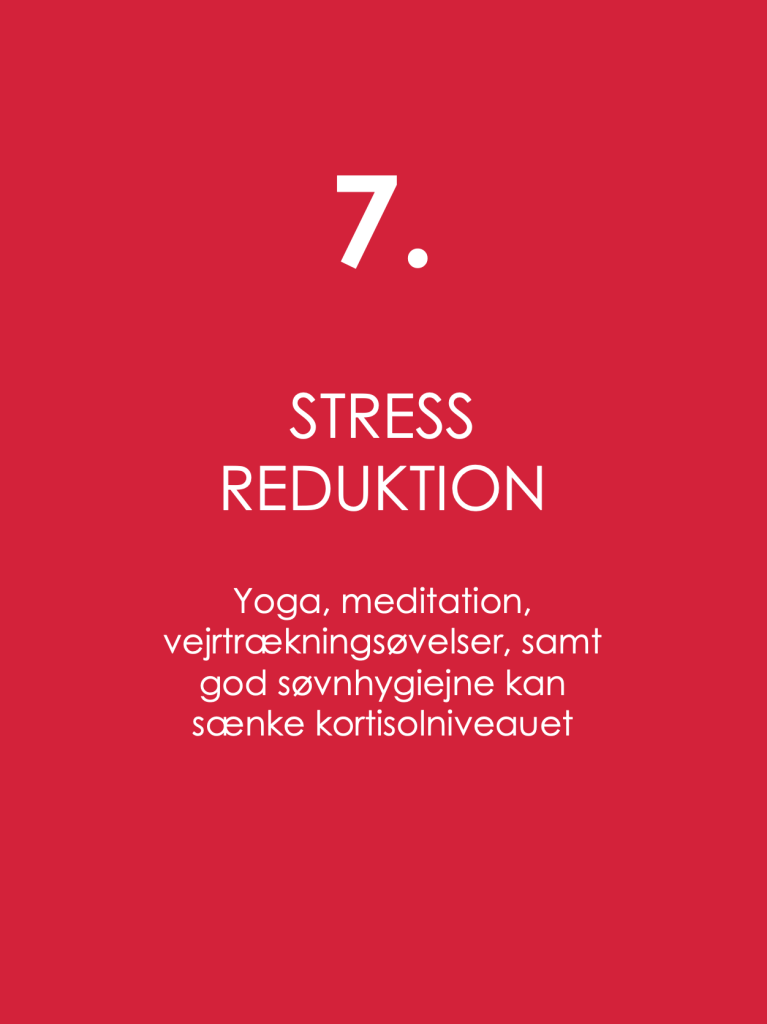 7. STRESS REDUKTION Yoga, meditation, vejrtrækningsøvelser, og god søvnhygiejne kan sænke kortisolniveauet.