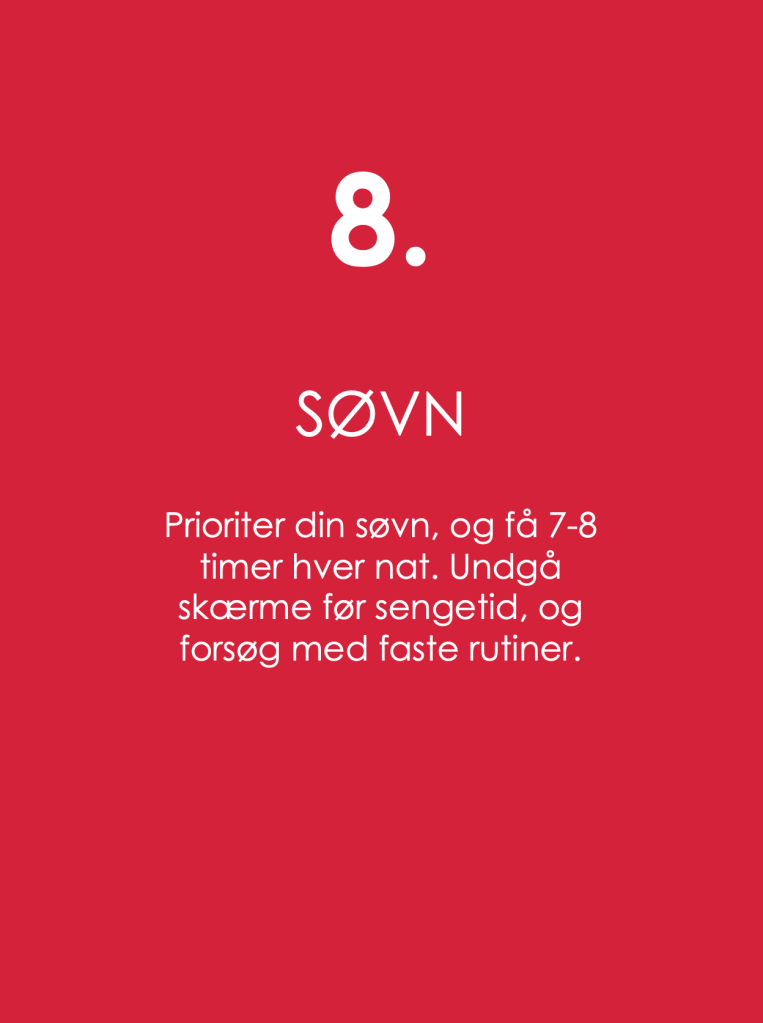 8. SØVN Prioriter 7–8 timers søvn. Undgå skærme før sengetid og hold faste sengetider.