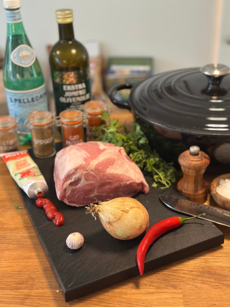 Pulled Pork kommer ud af et stykke langtidsstegt nakkestykke – fra grisen. Vælg altid økologisk og fritgående. Jeg laver det i en LeCreuset støbejernsgryde.