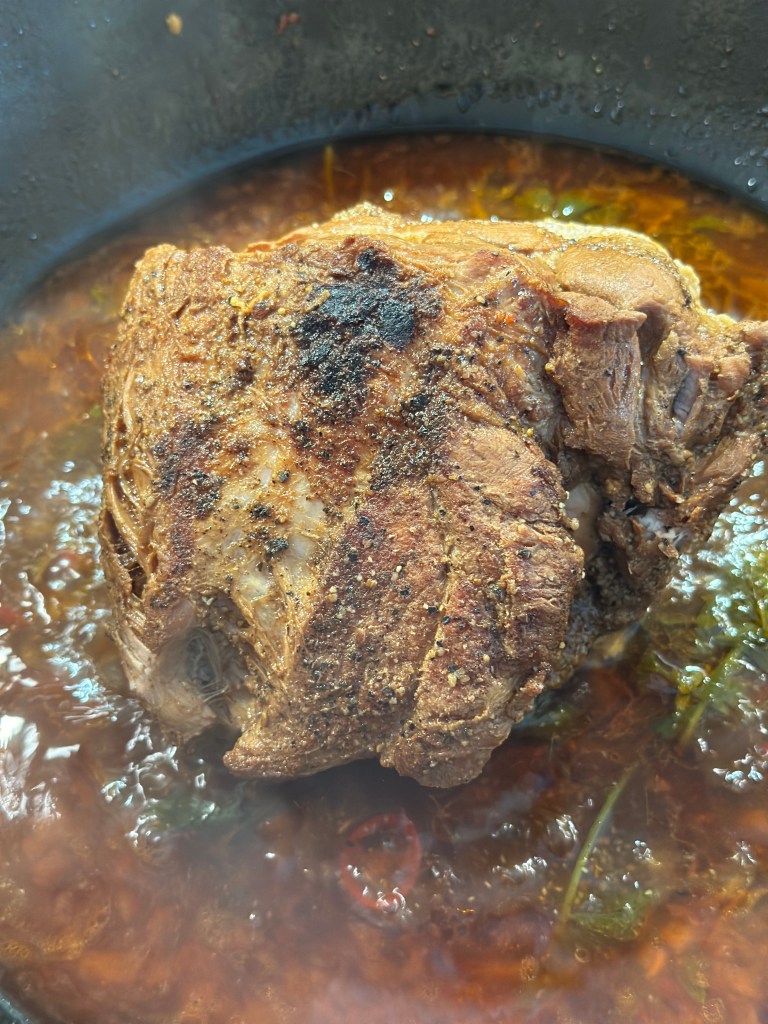 Varm gryden op, og tilsæt olivenolie. Når den er varm kommer man hakket løg, krydderier, og revet hvidløg sammen med tomatpure. Lad det simre lidt, og brun derefter kødet på alle sider. Når det har taget farve tilsætter du danskvand så det dækker 2/3 af stegen, kommer chili og persille i. Og så skal den bare stå i 3 timer for lave varme.