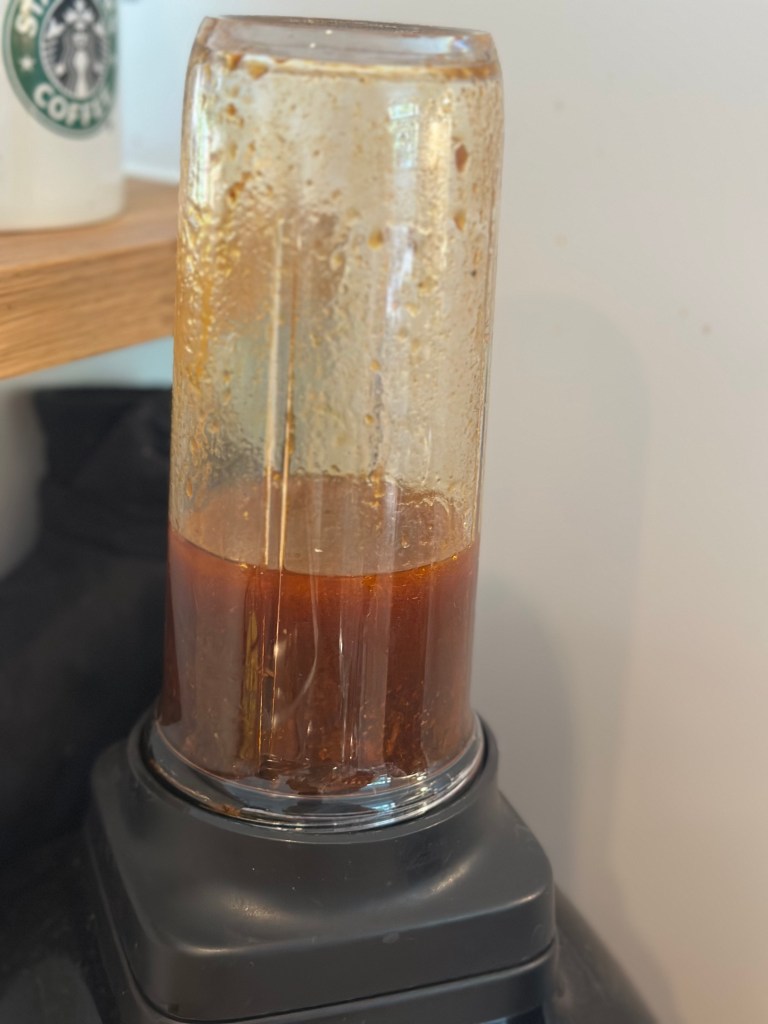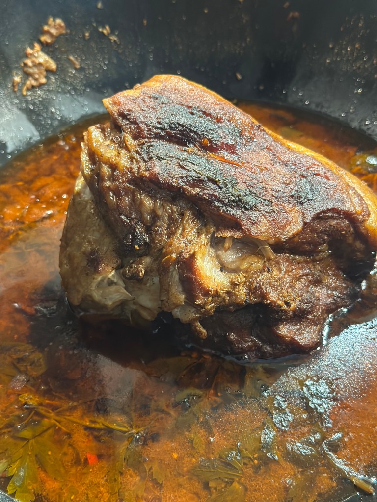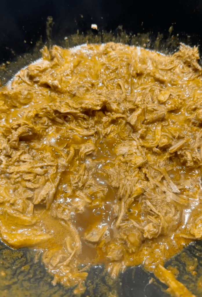 Herefter kan du tage den op og trække den fra hinanden. Væden kommer du i en blender og tilbage i gryden. Kommer kødet tilbage i, og blander godt. Smag til med salt og peber.