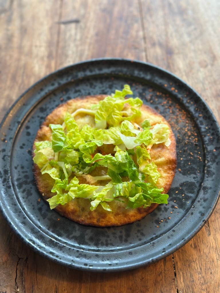 Jeg bygger op med den største i bunden. Kommer lidt japansk mayonnaise og lidt sesam chiliolie på. Og så salat af valgfri variation, og en klat guacamole. Kom næste tortilla på, og herefter pulled pork. Den mindste tortilla ovenpå, og til sidst en klat guacamole. Pynt med frisk majs og strimlerne.