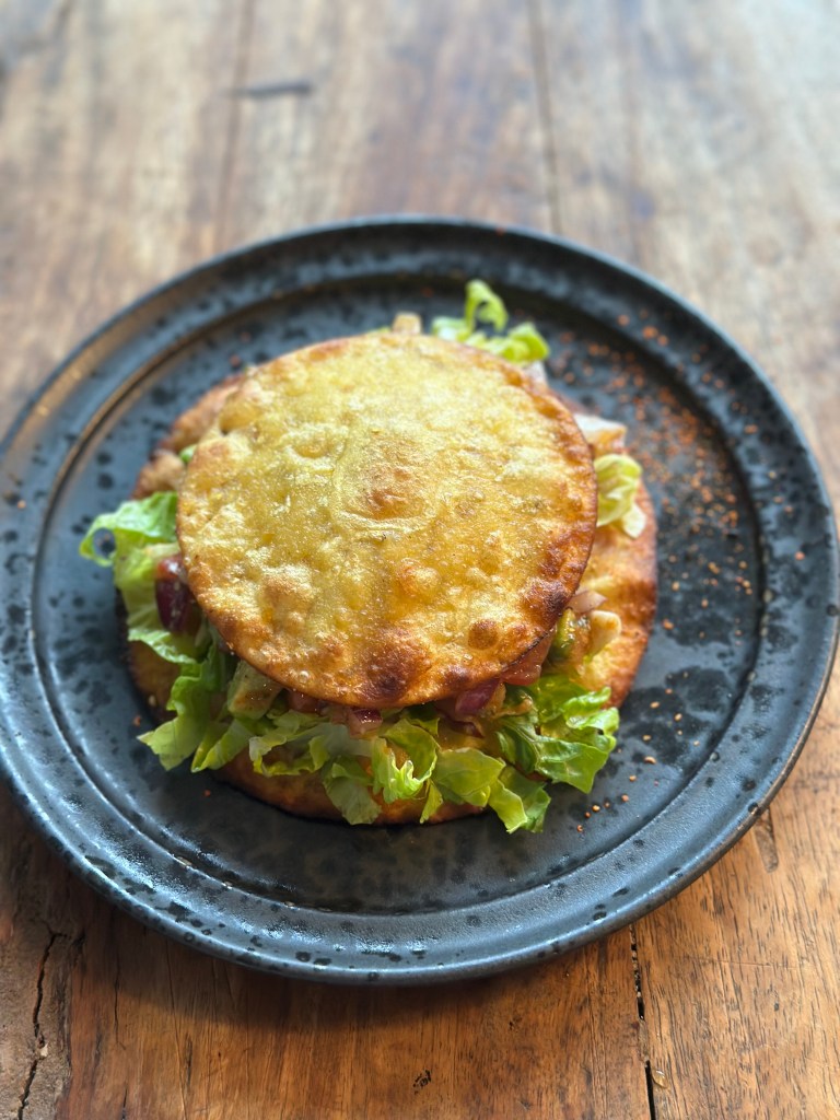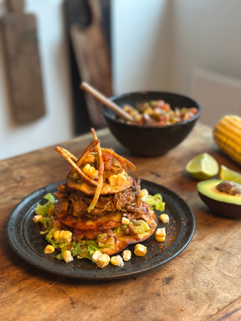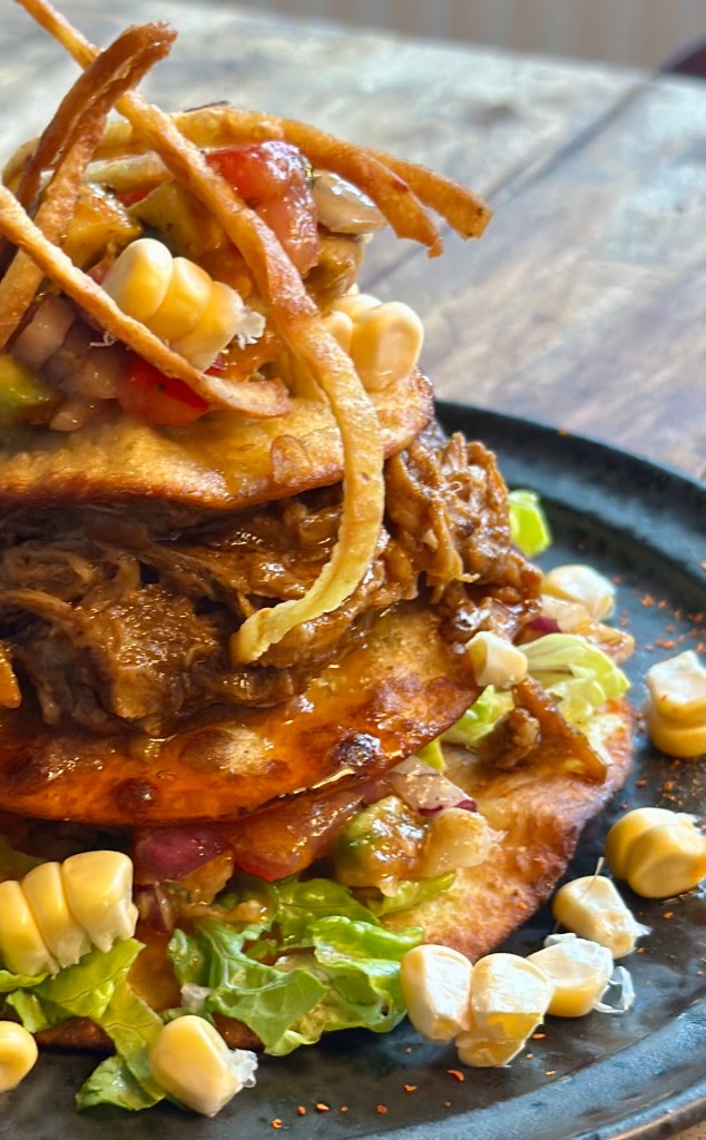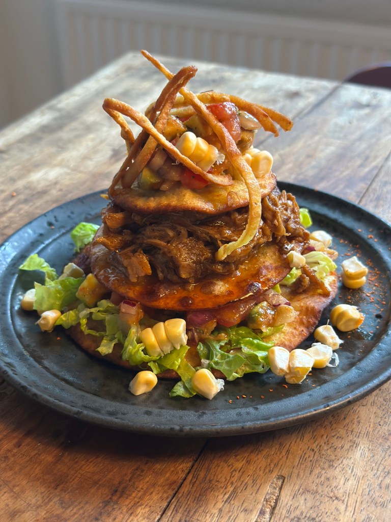 Tostada er nok ikke det rigtige svar på, hvad der er på talerkenen, men det er da en udbygning eller nærmere opbygning. Flest vil kalde den for en Tortilla Tower, så det gør vi.