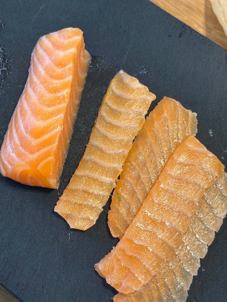 Jeg kalder det laksetatar, men i virkeligheden finthakker jeg blot en rigtig god røget laks.