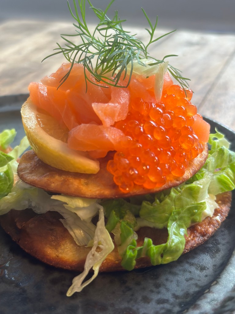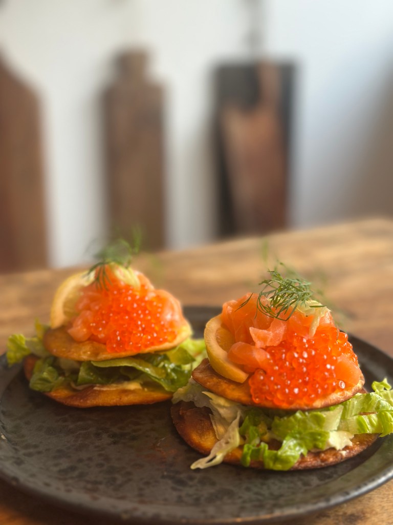 Jeg lægger den største tortilla i bunden. Herpå lægger jeg salat – og i denne version er det blot romainsalat som er skåret i små stykker, men du kan bruge den salat du har, eller ønsker. Jeg kommer en klat avocado creme på, og lægger den mindre tortilla ovenpå. Herpå kommer jeg laksen som jeg pynter med rigelige mængder ørredrogn, en citron båd og lidt dild og forårsløg på toppen.