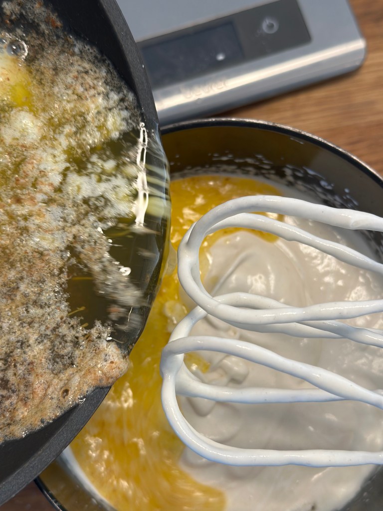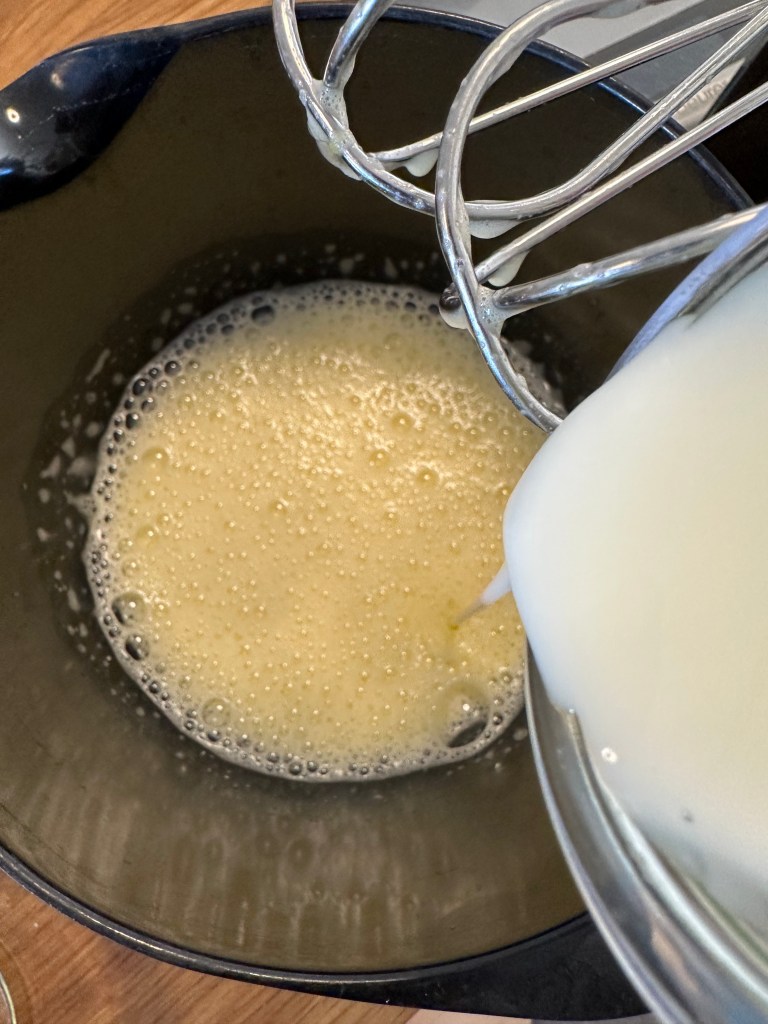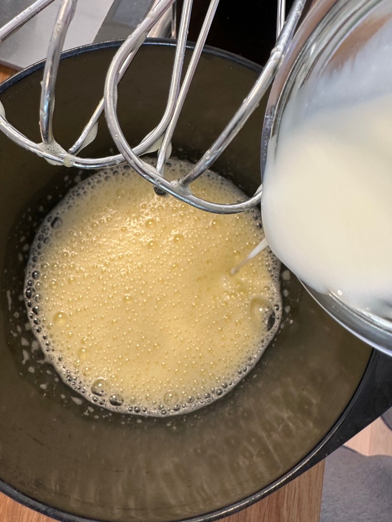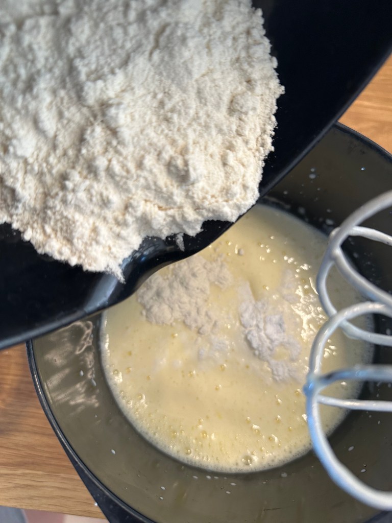 - Rør de tørre ingredienser i væsken lidt ad gangen, til dejen er glat.