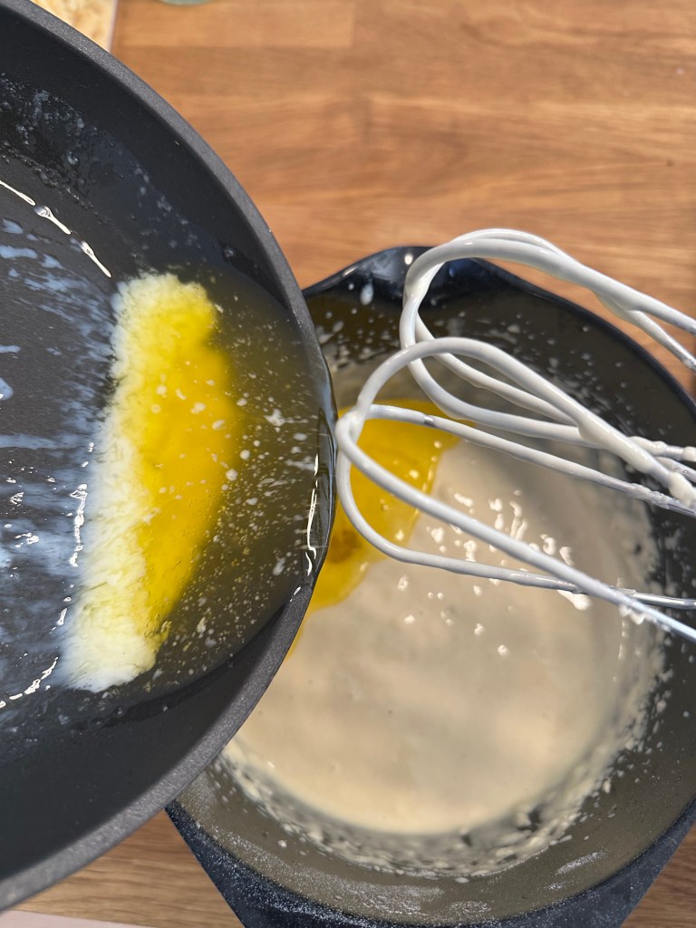 - Vend det smeltede smør i dejen. Lad den hvile 10–15 minutter.