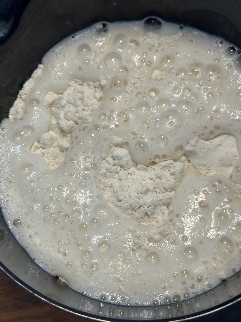 - Bland mel, bagepulver, salt og evt. sukker i en anden skål.