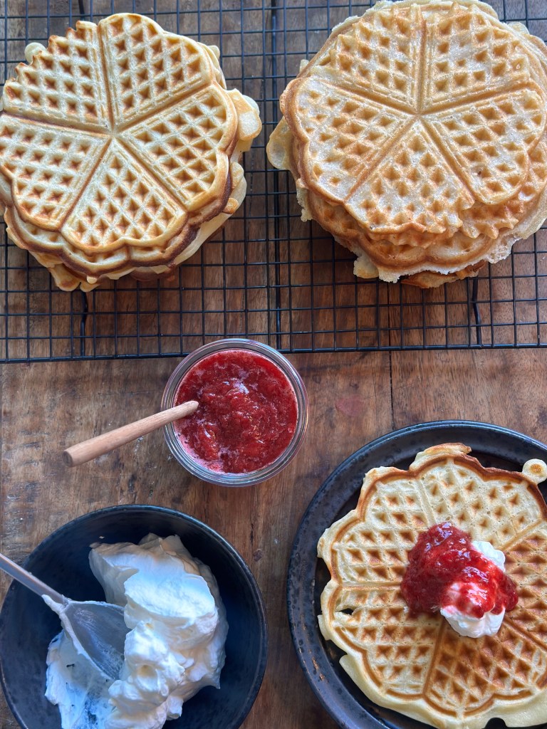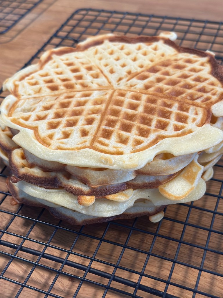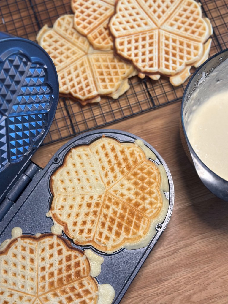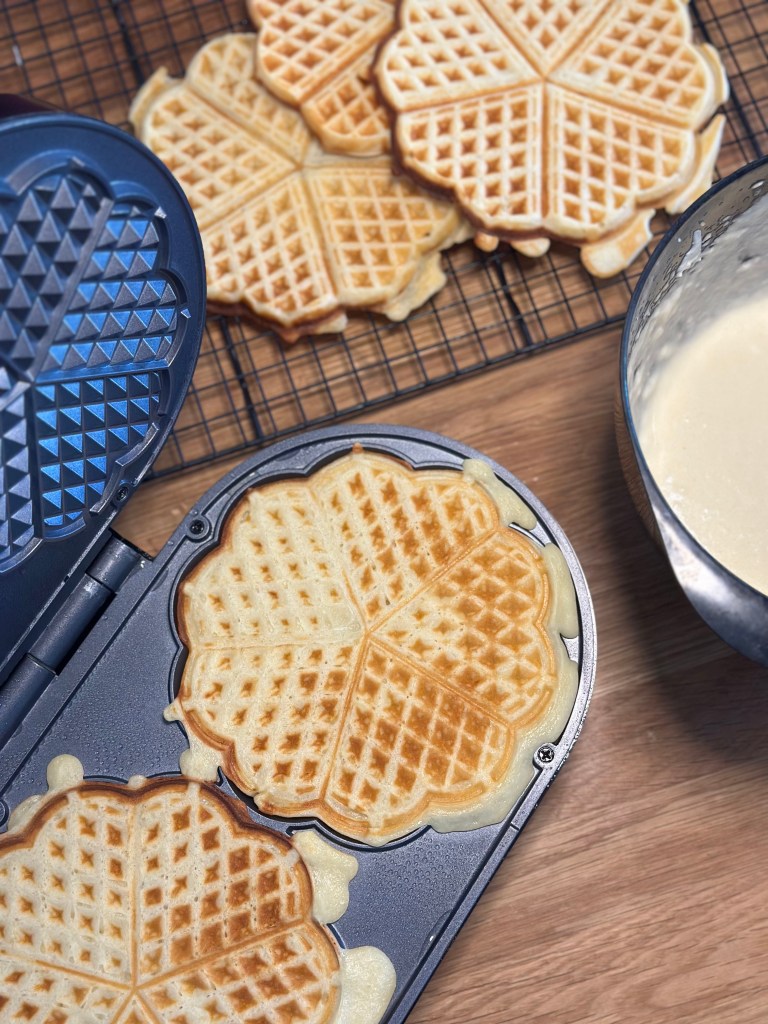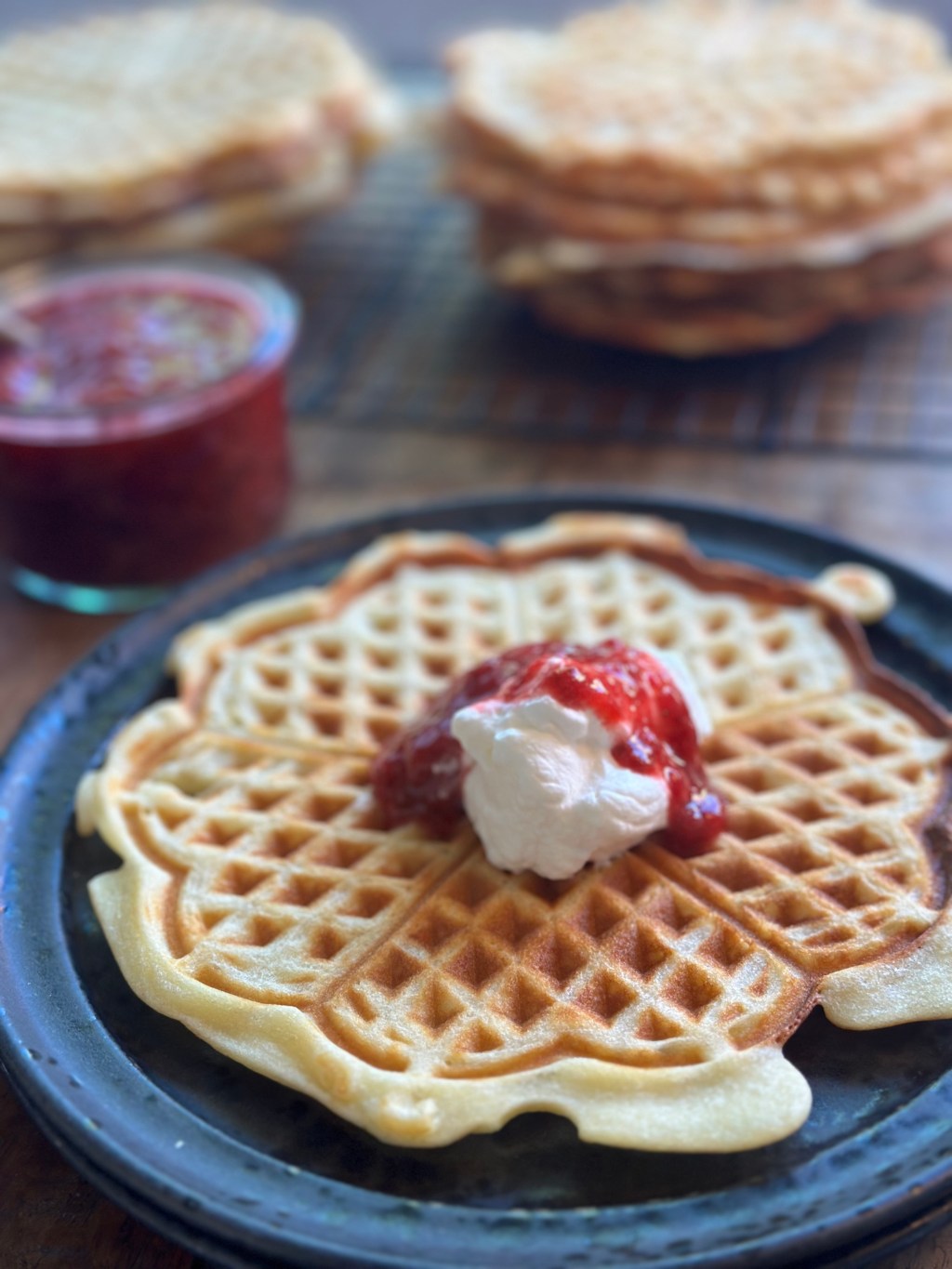 Vafler findes i så mange forskellige versioner. Da jeg var barn, fik jeg købevafler med chokolade imellem som blev serveret til trefarvet is. Først i mit tidlige voksne liv begyndte jeg at lave den selv, efter at have fået dem forskellige steder i verden.