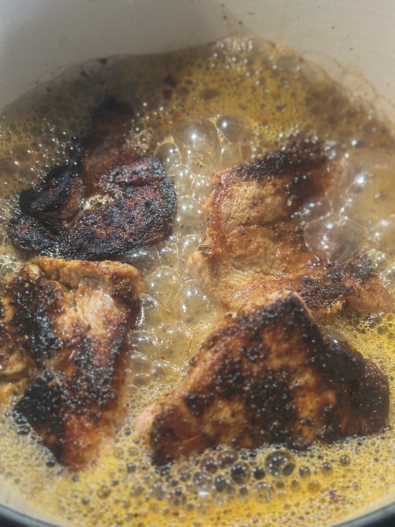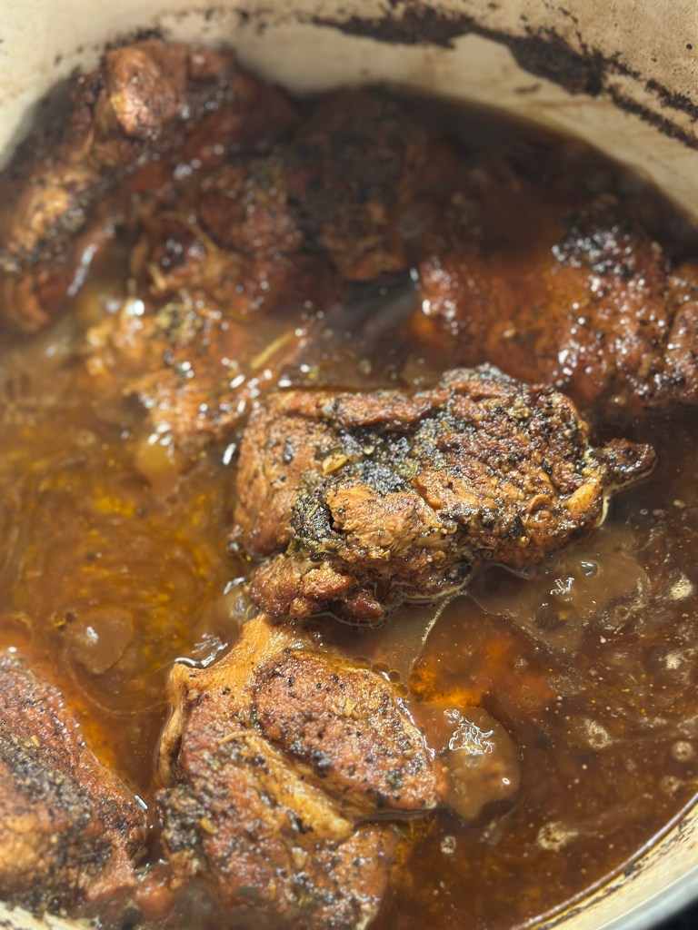 Det er vigtigt, at vælge et godt stykke kød. Skær stegen i 6-8 stykker. Brun smørret i en støbejernsgryde og kom halvdelen af krydderiblandingen samt hvidløg i. Bland godt, og brun kødet i – helst at 2 omgange afhængig af grydens størrelse. Kom alt kødet tilbage i, og hæld cola over så det dækker. Kom resten af krydderiblandingen i, samt salt og peber.