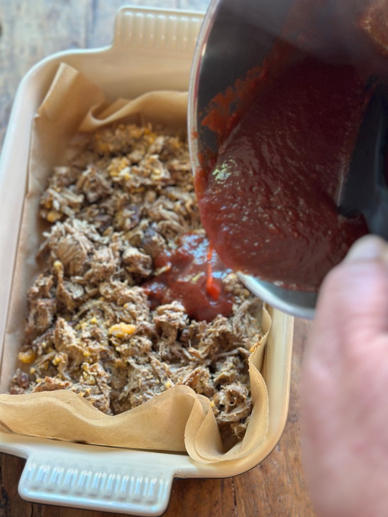 Tag en bradepande og læg et stykke bagepapir i bunden. Kom herefter den ønskede mængde pulled pork i, og hæld barbecue sauce over. Bland godt, og kom i ovnen i 10-15 minutter ved høj varme – gerne grill hvis du holder øje. Og så er den klar til brug.