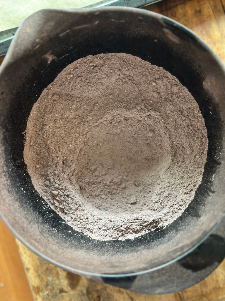 Bland alle de “tørre” elementer med et piskeris. Pisk herefter hviderne luftige. Bland herefter det hele sammen til en klistret masse. Brug en ske til at placere klatter på en bageplade med bagepapir.