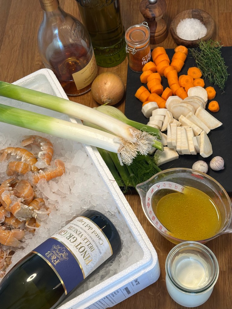 Du skal allerførst foreberede en fiskefond – det fede er, at mange af ingredienserne er de samme. Men hvorfor så lave en seperat fiskefond ? Fordi jomfruhummerskallerne godt kan bleve meget kraftige og let bitre – så når man lave en fiskefond for sig selv, så bliver bisquen mere “smoothie” og lækker. Så min opskrift på fiskefond her !