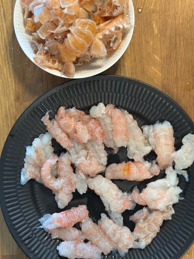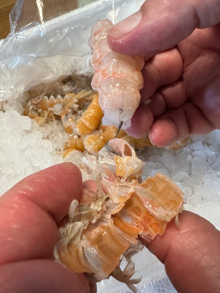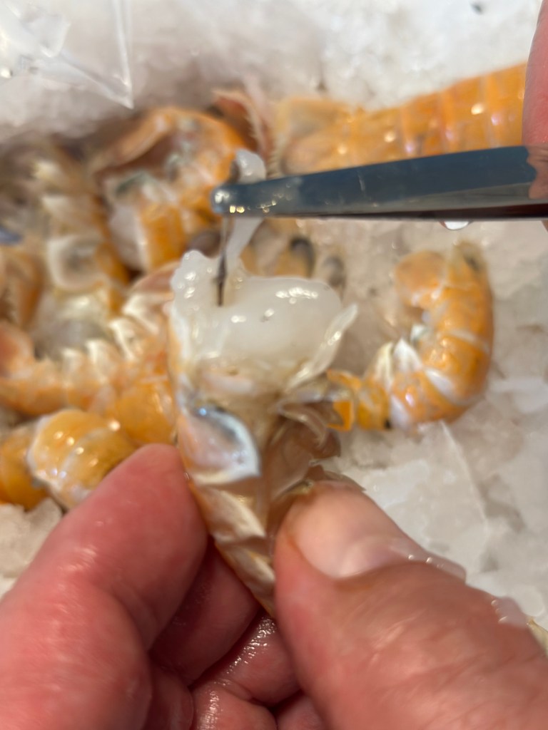 Jomfruhummerhalerne tager du kødet ud af skallerne, og fjerner tarmen (vigtigt). Det er en tynd sort streng som løber igennem hele længden. Se billede. Det tager lidt tid, og du skal være omhyggelig.