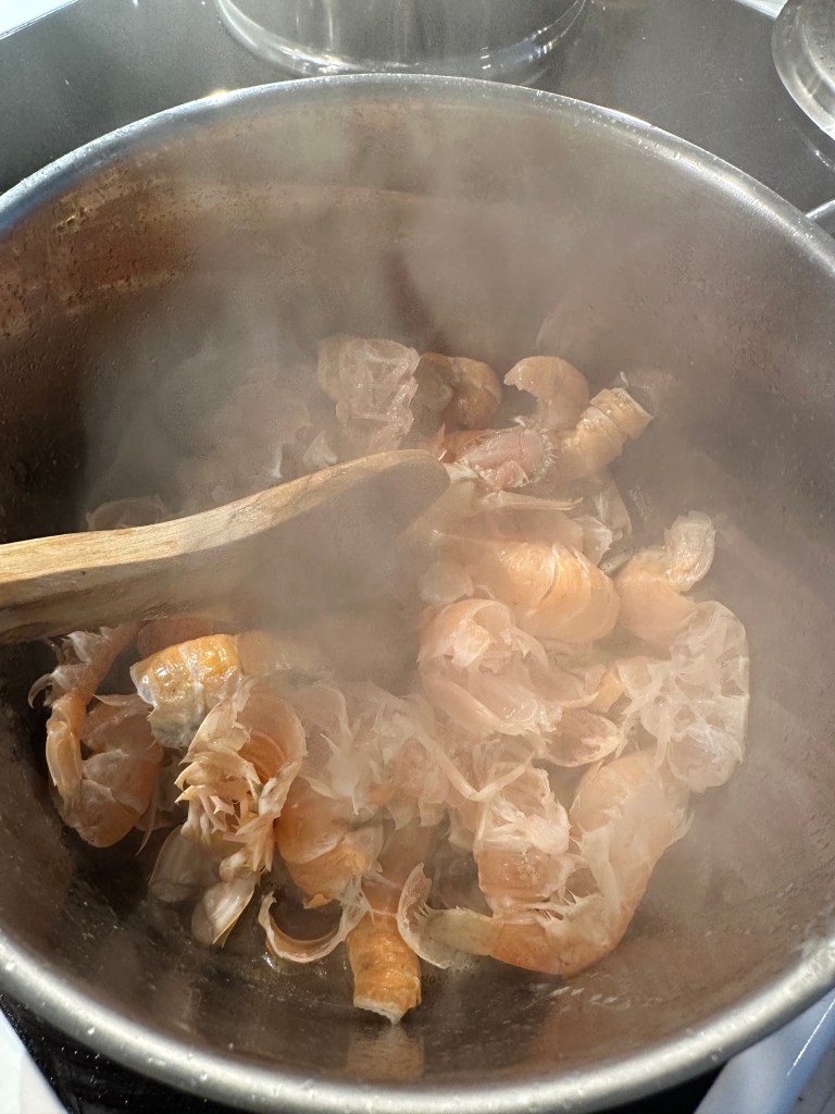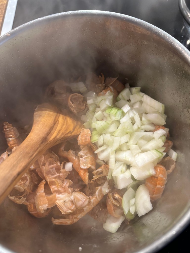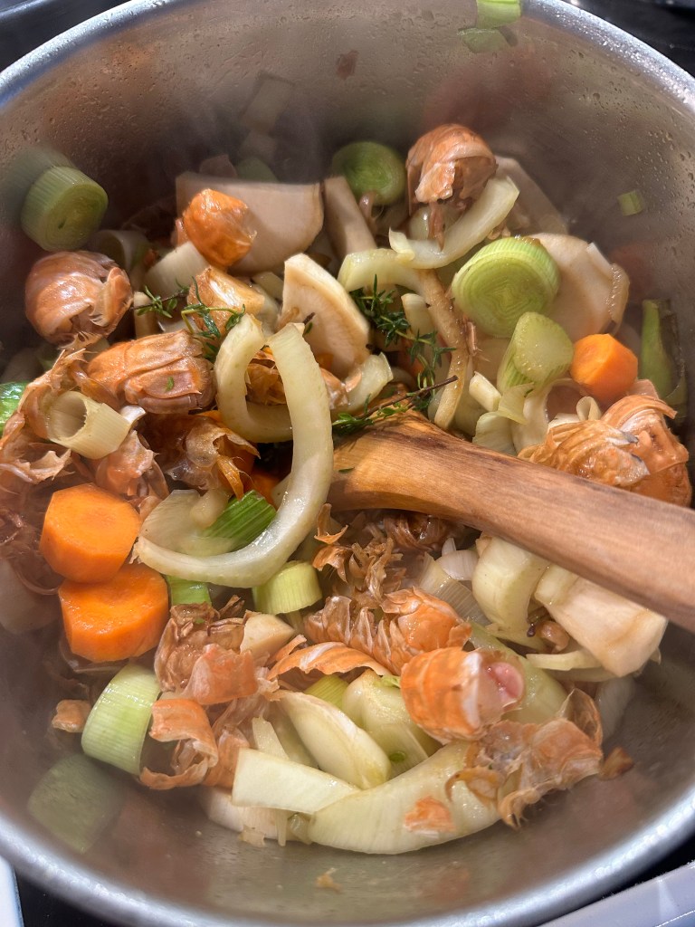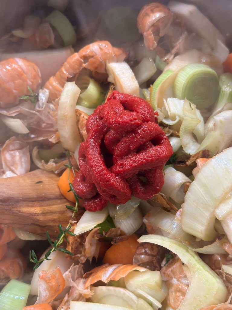 Kom olie og smør i en gryde – ved mellemhøj varme kommer du jomfruhummerskallerne i og rister dem godt af. Herefter kommer du løg og hvidløg i. Efter de er vendt godt, kommer du resten af grøntsagerne i og tilsætter tomatpure – sørg for den kommer ned i bunden og bliver ristet godt af.