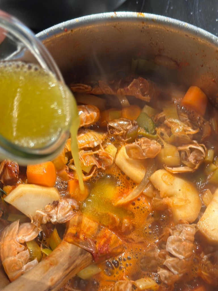 Teknikken er kendetegnet ved at man rister skallerne, koger dem med grøntsager, vin og krydderurter, og derefter blender og sier suppen, så alle smagsstoffer fra skallerne udnyttes. Det giver den dybe, intense smag og den karakteristiske orange farve.