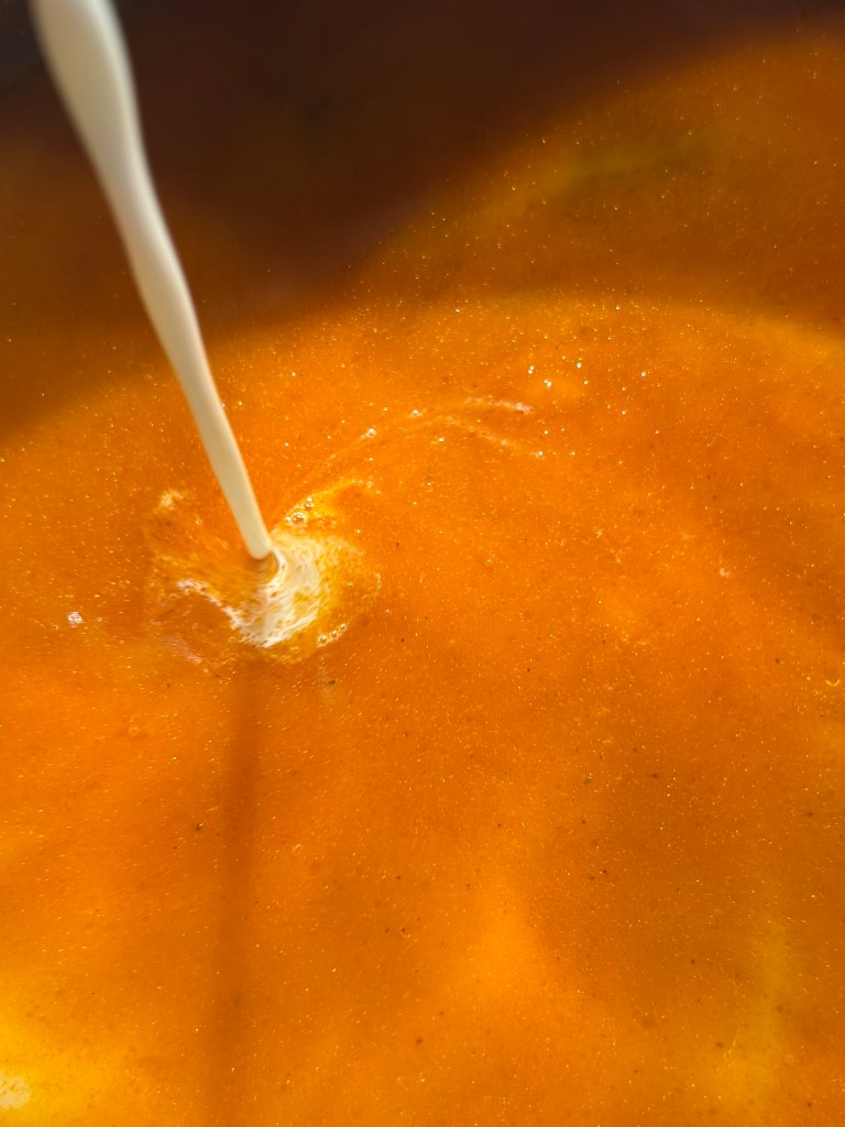 Si alt fyldet fra og tilsæt fløde. Og så skal den blot smages til med salt og peber.