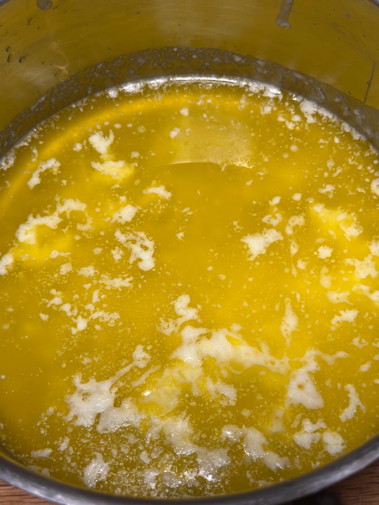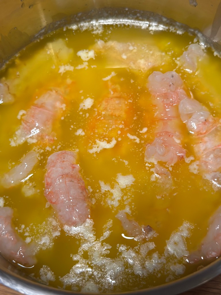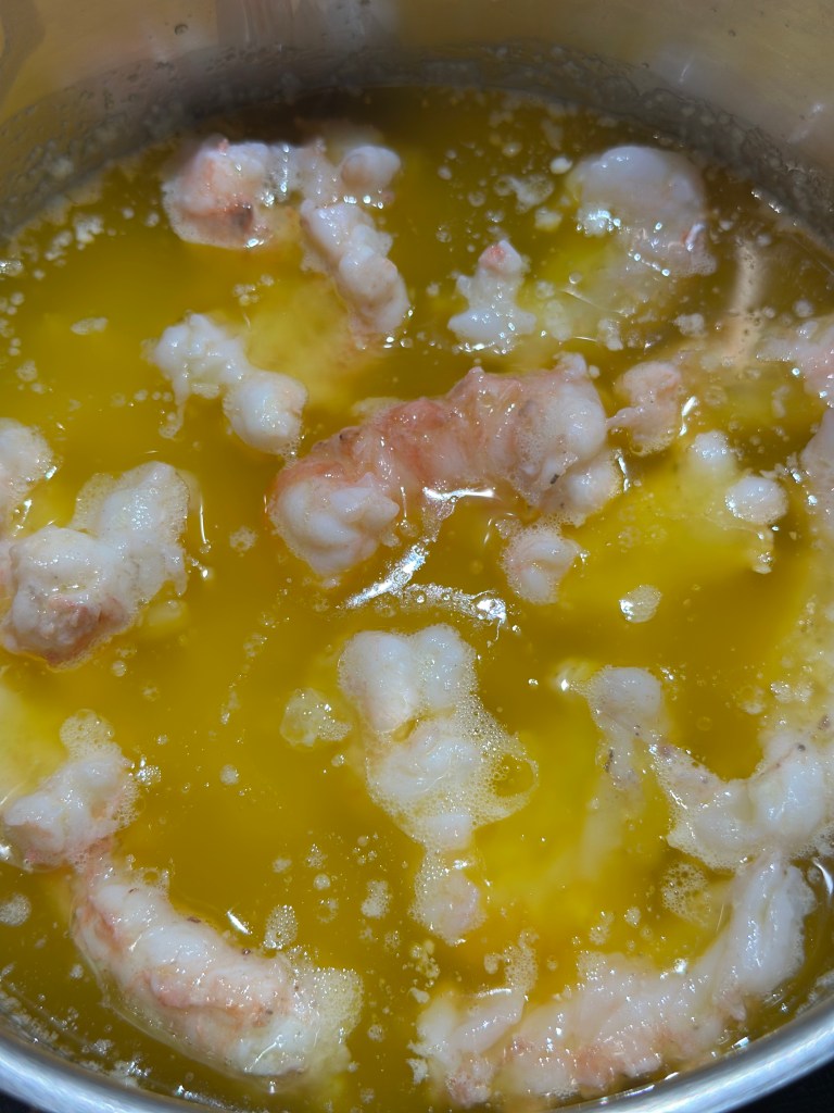 Tag en kasserolle og kom 200 gram smør i. Når den er smeltet – ikke brunet, så kommer du 6-7 jomfruhummerhaler i af gangen. Smørret skal lige blive varmt igen, og du kan lige teste med en enkelt, og den er tilberedt.