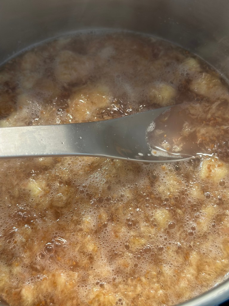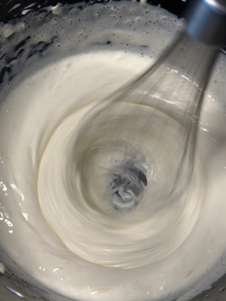 Pisk det godt, og bliv ikke forskrækket over massen først bliver tyndere, før den bliver til tykkere igen.