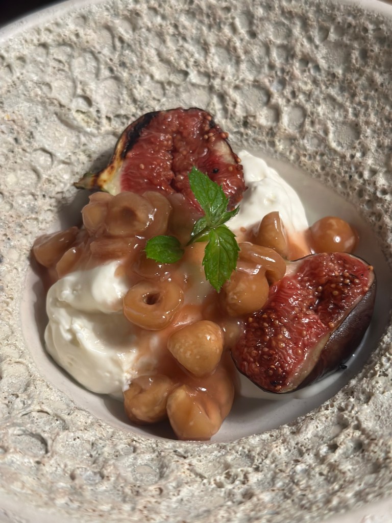 Grillet Figner med Mascarpone, figen/yuzu sirup og hasselnødder.