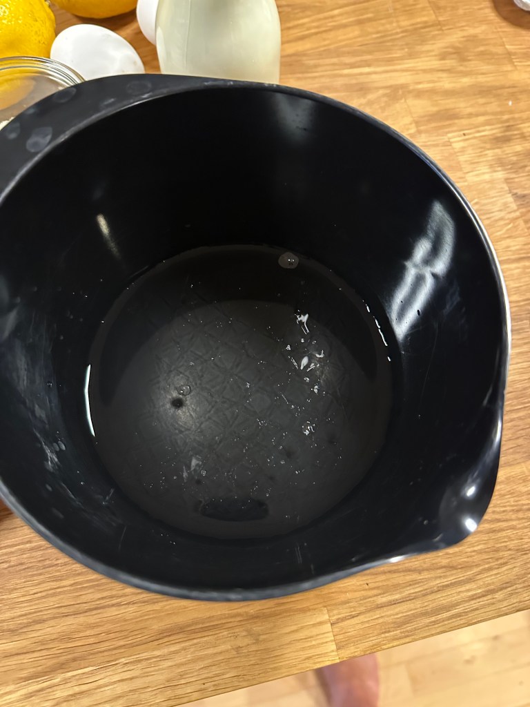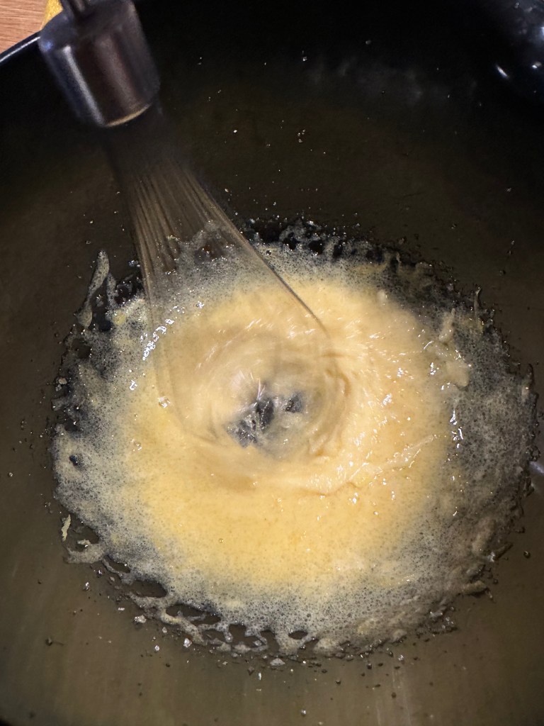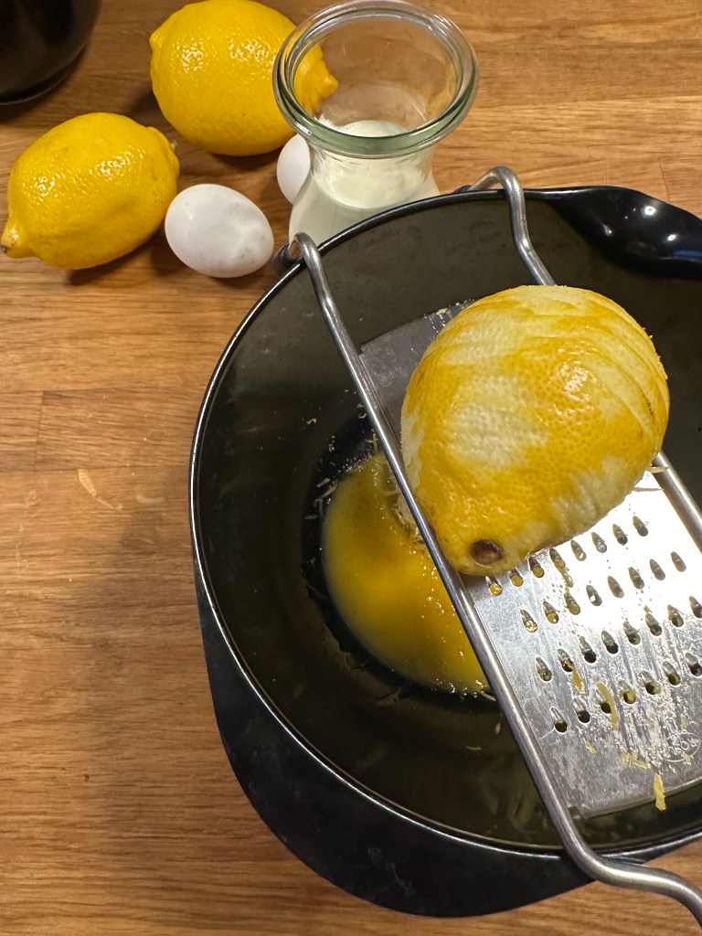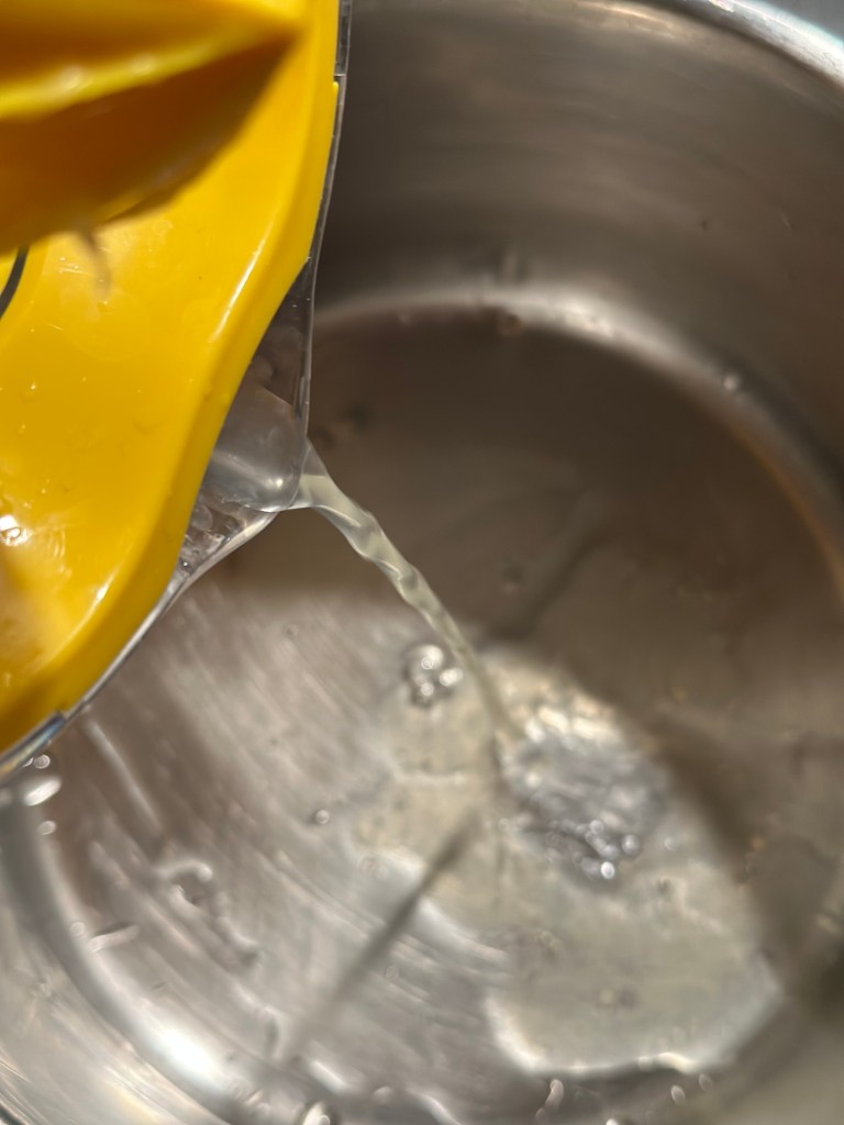 - Kom husblas i en kasserolle og varm forsigtig op – svag varme. Når det er smeltet, kommer du citronsaft og revet citron i. Pisk det godt sammen. Men varm ikke op.