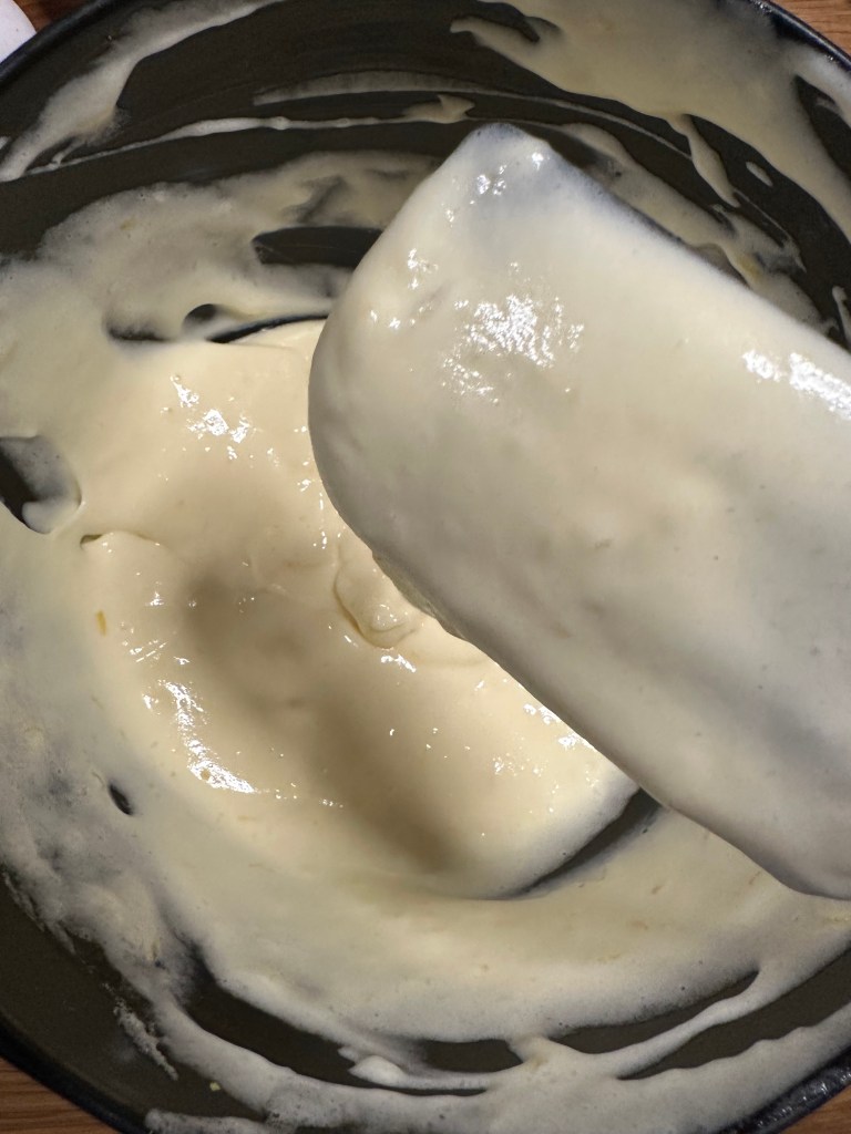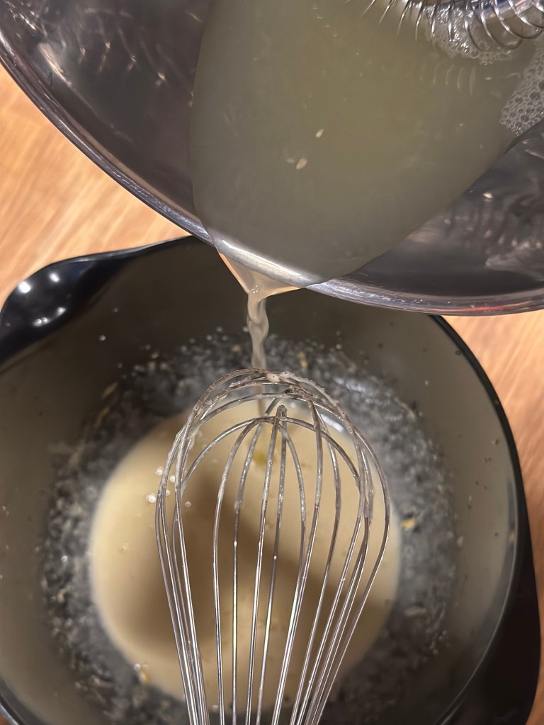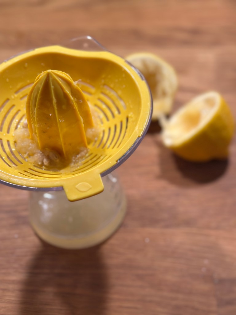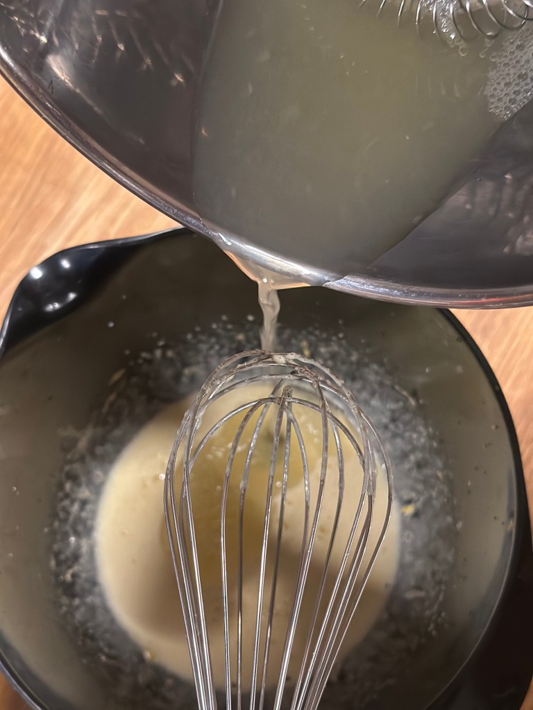 - Kom husblas i en kasserolle og varm forsigtig op – svag varme. Når det er smeltet, kommer du citronsaft og revet citron i. Pisk det godt sammen. Men varm ikke op.