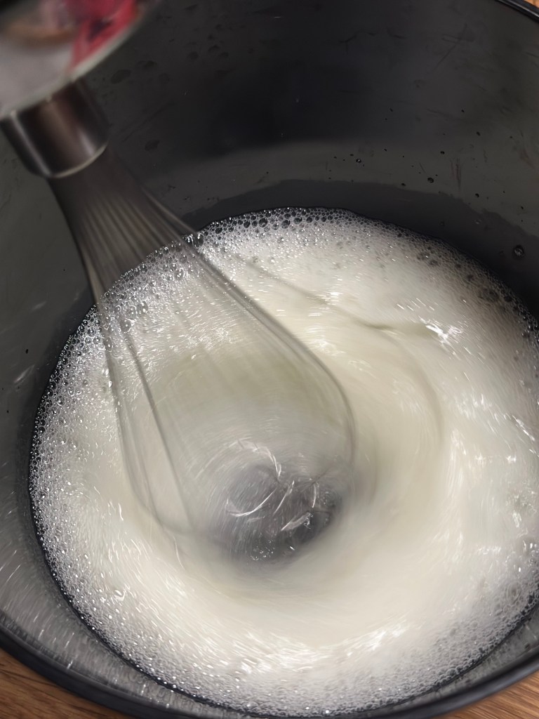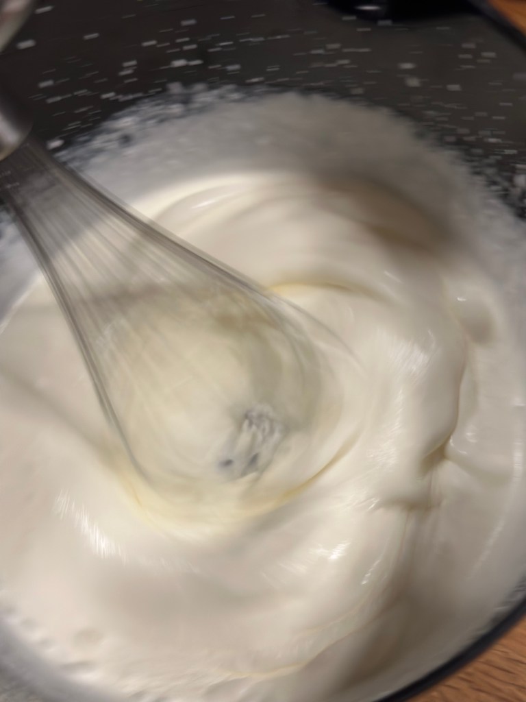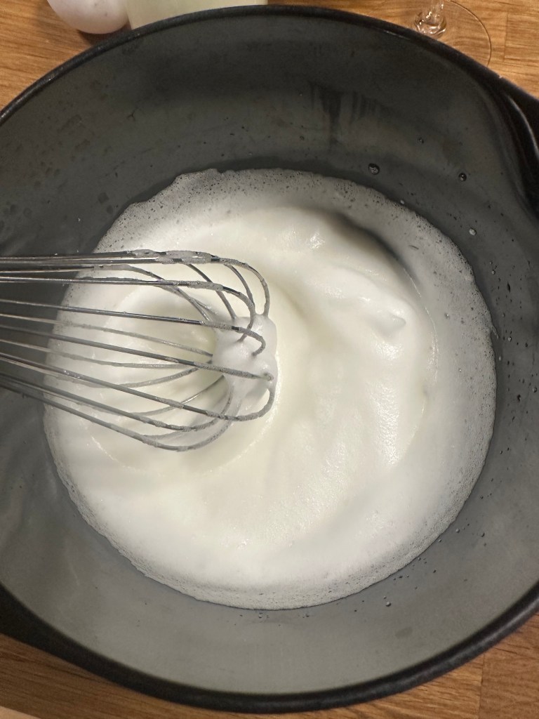 - Pisk æggehviderne og pisk fløden – i hver sin skål og begge stift og luftige