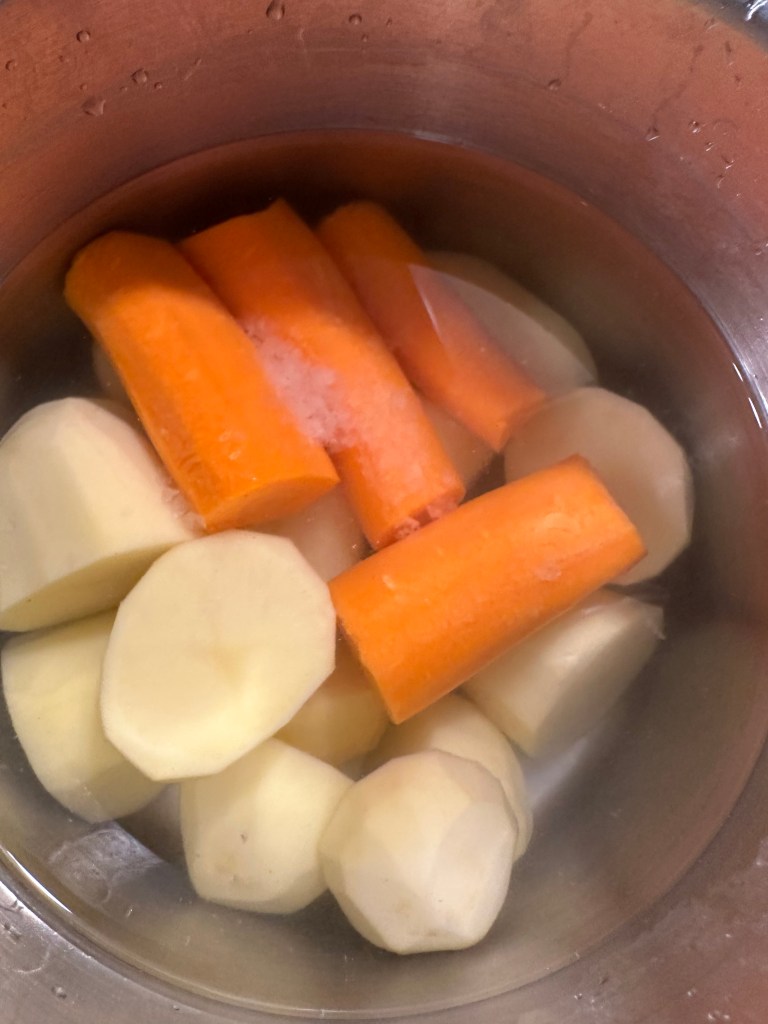 Skræl kartofler og gulerødder. Skær kartoflerne i mindre stykker – gulerødderne i halve. Kog dem samme i godt med vand og med rigelig salt. Der skal være godt møre.
