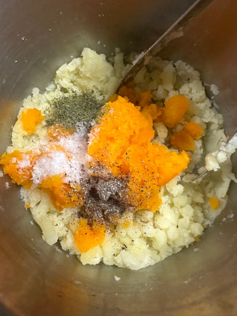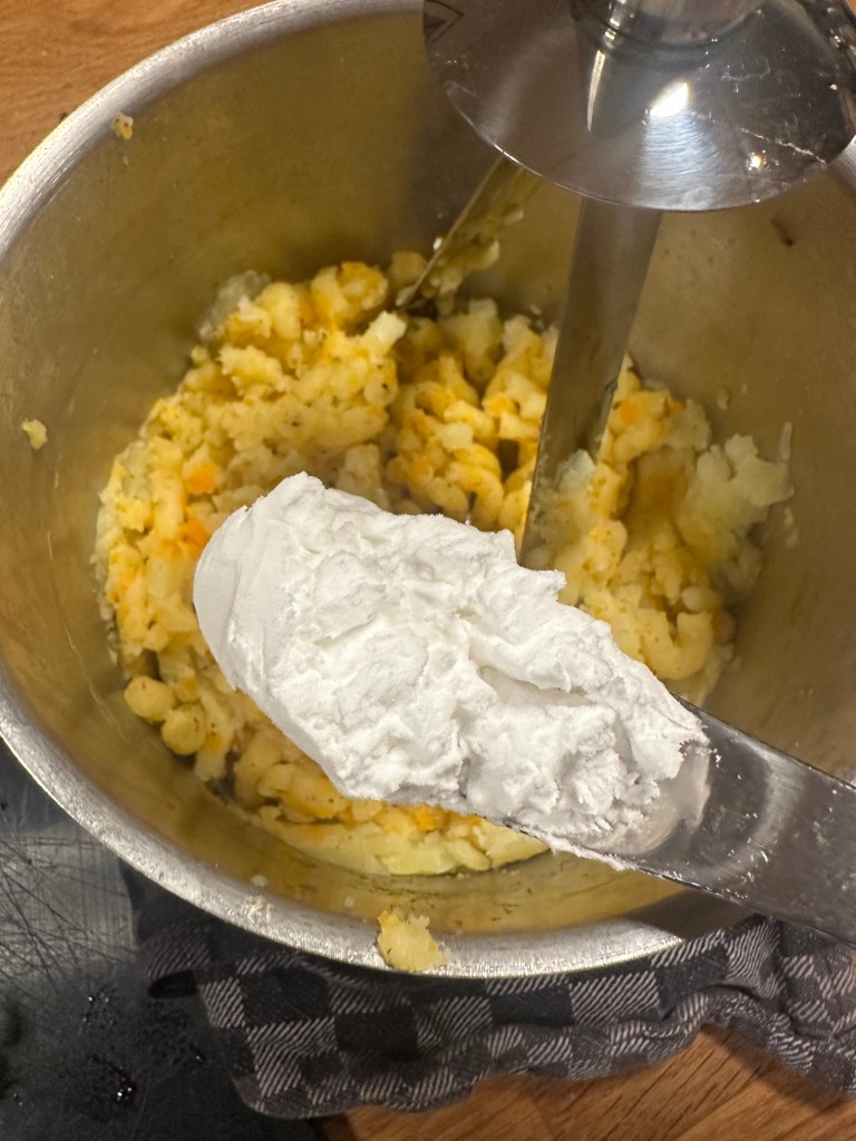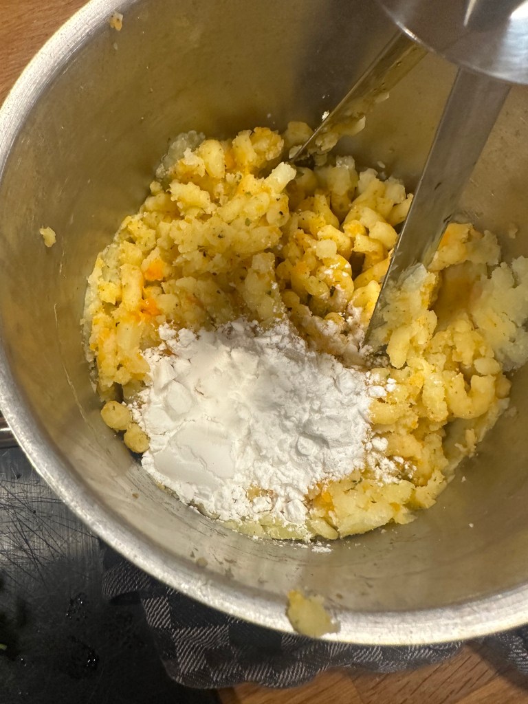 Bland kartoffelmosen med finthakket persille, salt, peber og kartoffelmel. Jeg bruger bare kartoffelmoseren til det.