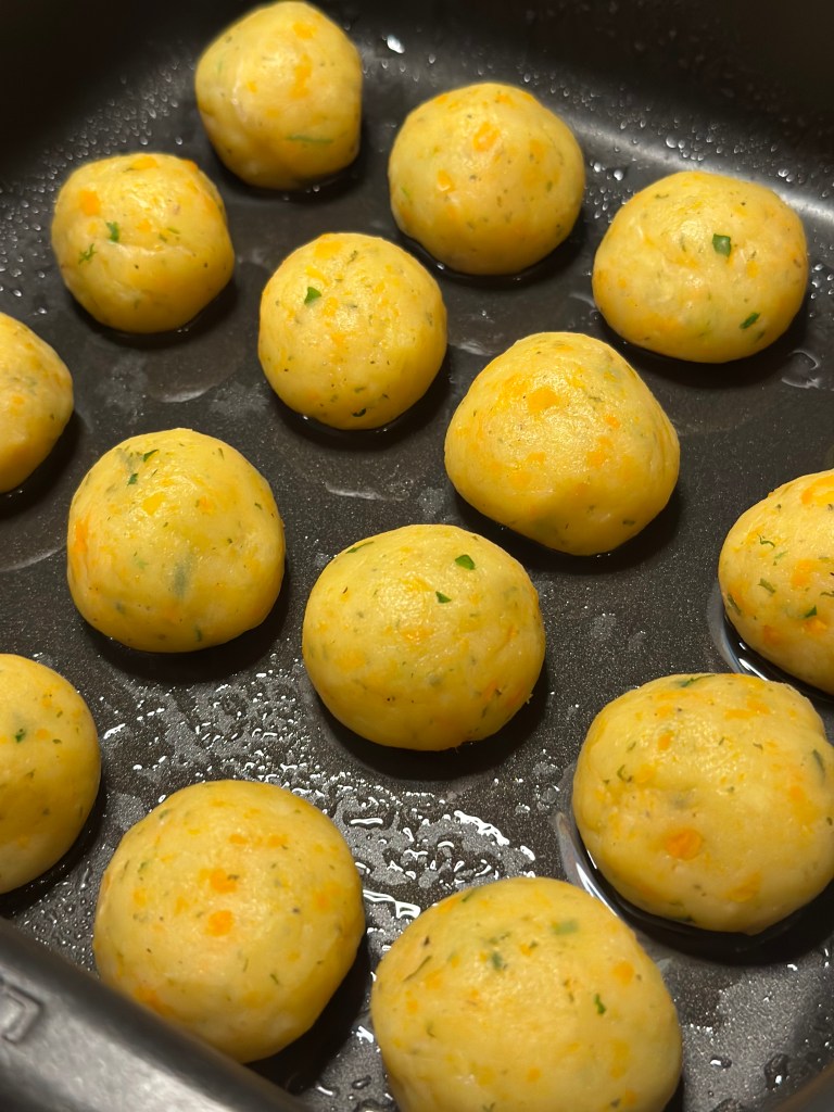 Den oprindelige måde at tilberede dem, er ligesom med melboller til suppe, hvor man kommer dem i gryden med vand, og når de “popper op” er de færdige. Og lad det være sagt med det samme – sådan laver jeg dem ikke. Dels fordi jeg ikke kan forestille mig at sætte tænderne i sådan en kogt bolle, men hvis der er noget som kendetegner Tysk mad, så er det brunt med beige på.