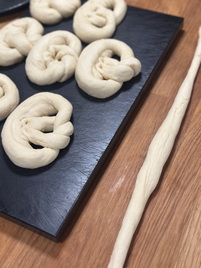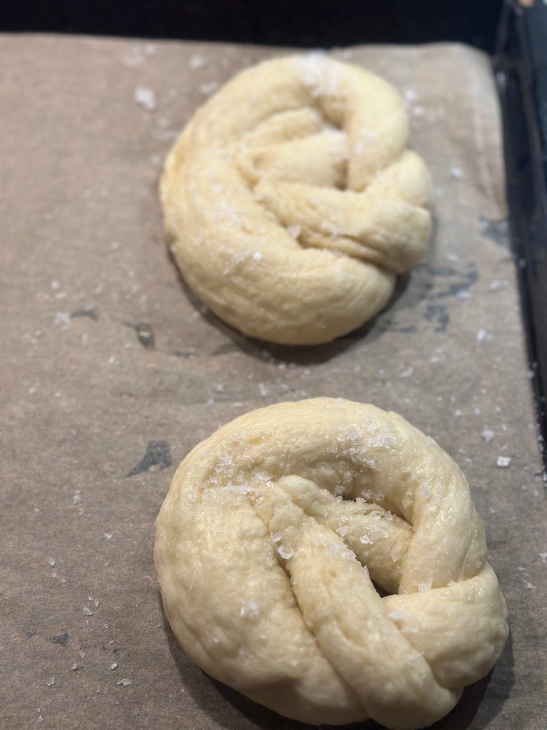 - Læg kringlerne på en bageplade med bagepapir.